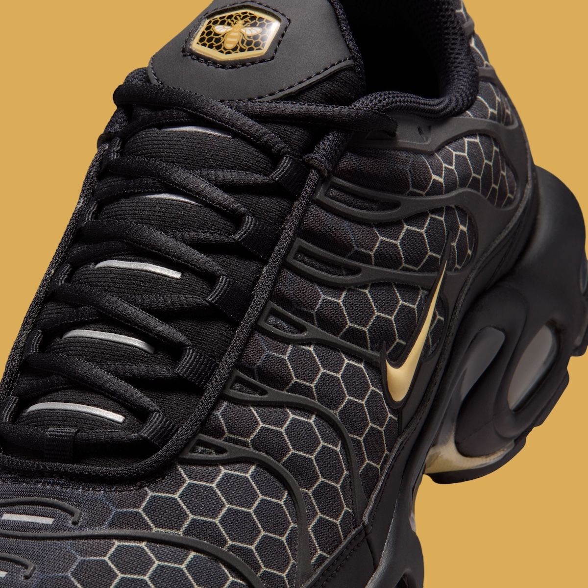 A light yellow hexagon pattern replaces the standard mesh, changing how the upper reads without altering the silhouette. Darker yellow details anchor the Swoosh, midfoot shank, and Air units below. A gold bee lands on the tongue and heel lining, quietly explaining the concept without spelling it out.