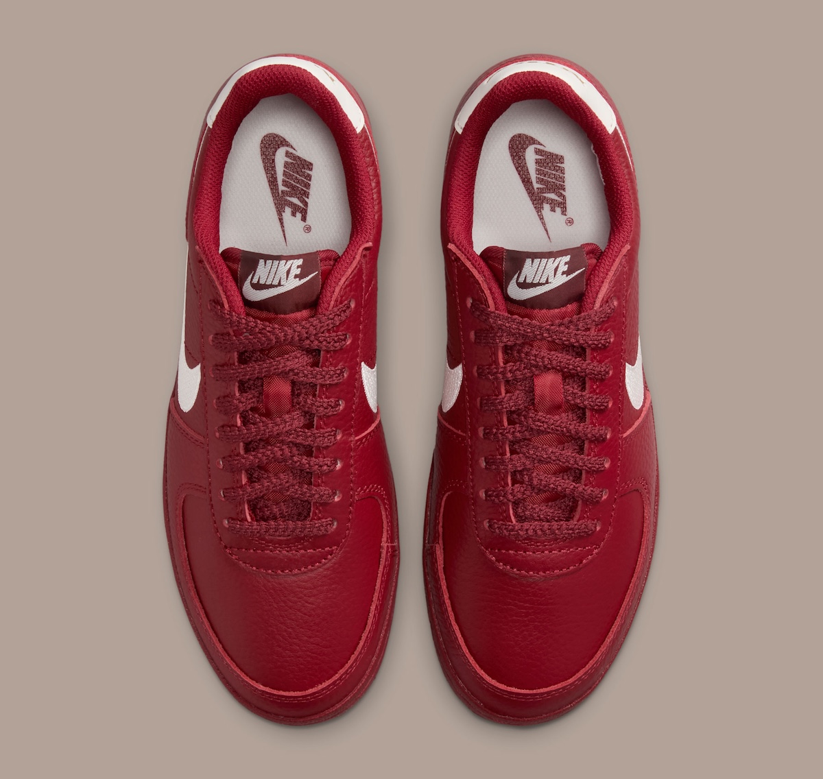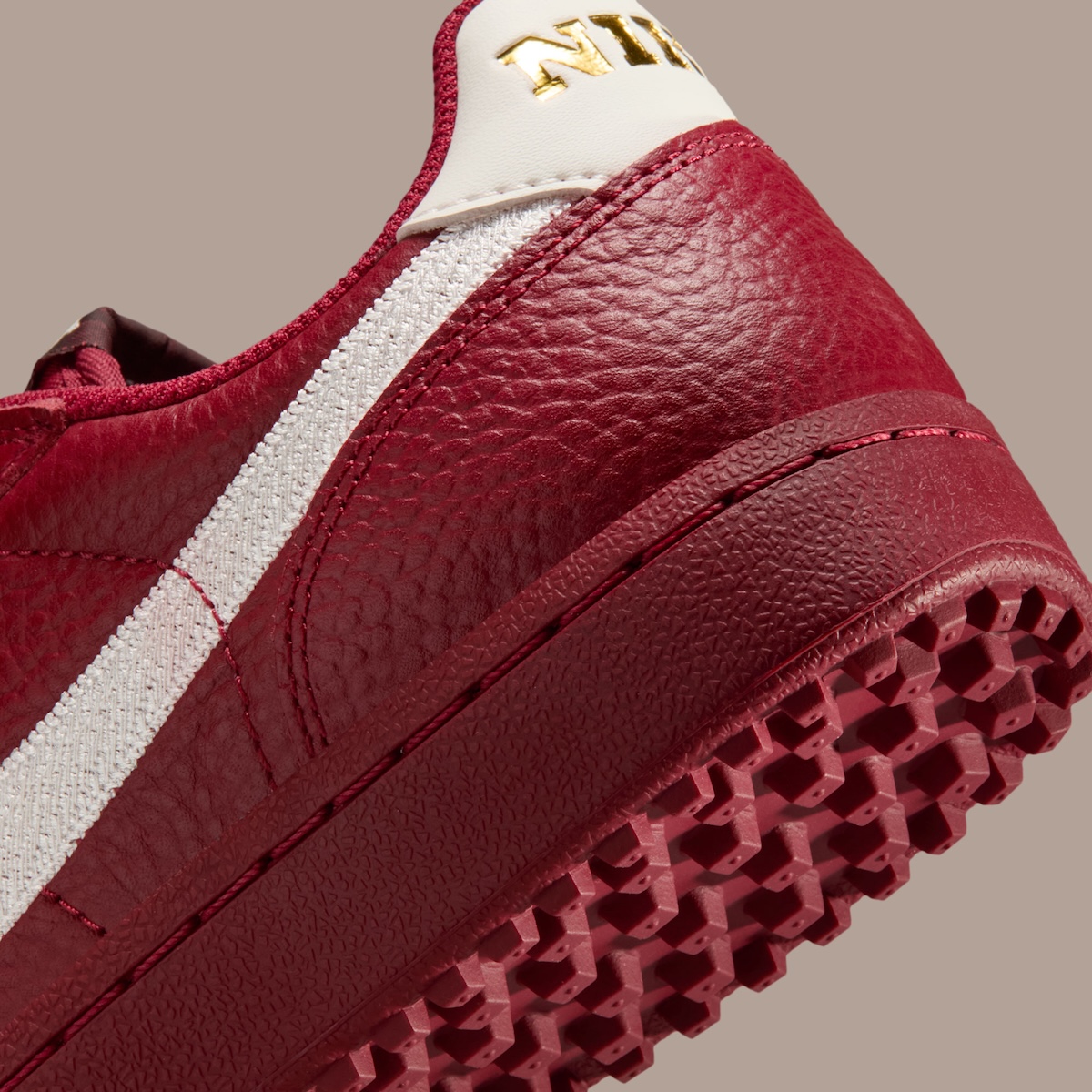 This Field General upper arrives in tumbled leather, delivering texture that feels deliberate rather than decorative. Sail Swooshes soften the deep red base, while Metallic Gold heel branding adds restrained contrast.
