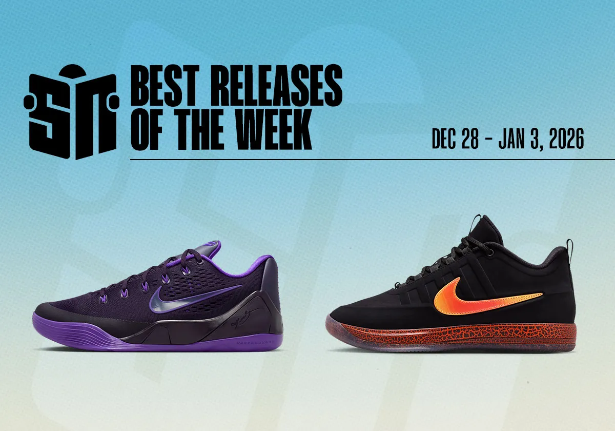 January 1st is the money day, beginning with the Nike Kobe 9 EM Stitches, a nod to Bryant clawing back from injury with a smattering of purple tones. From there, the NIGO Air Force 3 “Varsity Jacket” earns yet another chapter, continuing to lean on throwback Americana aesthetics. The Jordan 3 “We Outside” celebrates both play and ACG design language. Two A-list Swoosh’s female hoopers each drop off duos: the Nike Sabrina 3 Iron Grey and Sabrina 3 “Walnut,” and the Nike A’One Smokey Mauve and Nike A’One Pearls. In a brief running divergence, the Nike Vomero Plus “Ekiden” touches down, and on the Three Stripes’ end, a new Liberty London Samba comes available. Closing on the hardwood, the Ja 3 “Astronaut” and Giannis Freak 7 “Deception” round out the Swoosh’s big day.