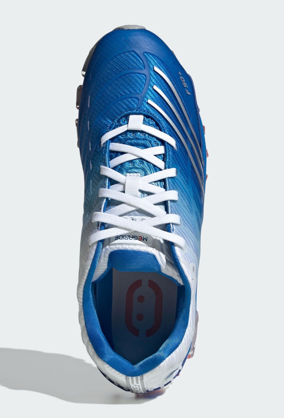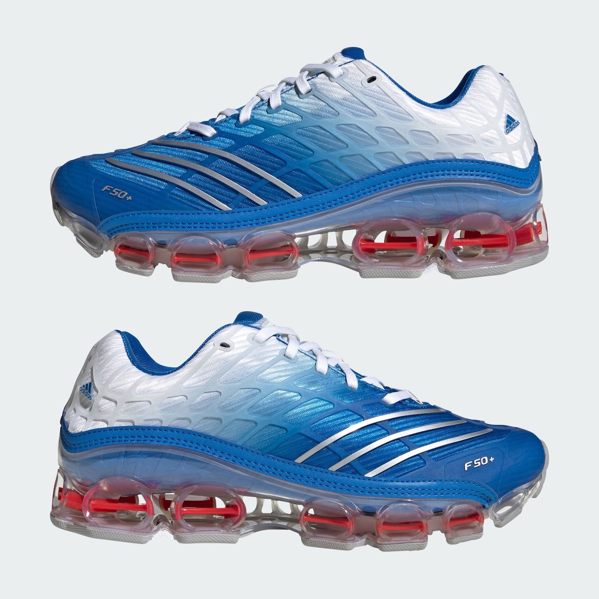The upper fades from white to layered blues, echoing classic speed silhouettes from adidas’ F50 lineage. Ribbed synthetic overlays reinforce the mesh, creating structure without visual clutter. Metallic Three Stripes sharpen the profile, while subtle F50+ branding reinforces the model’s performance roots.