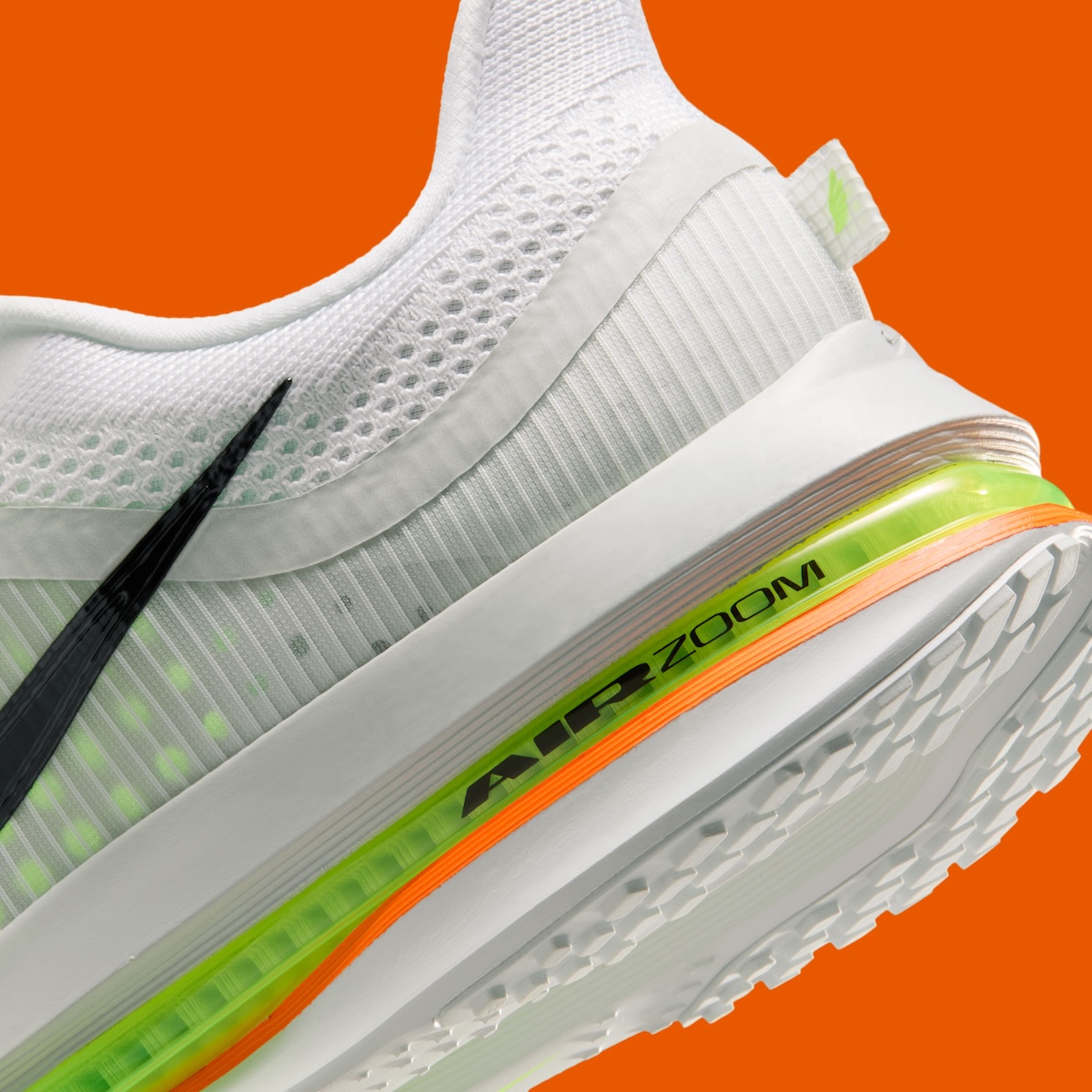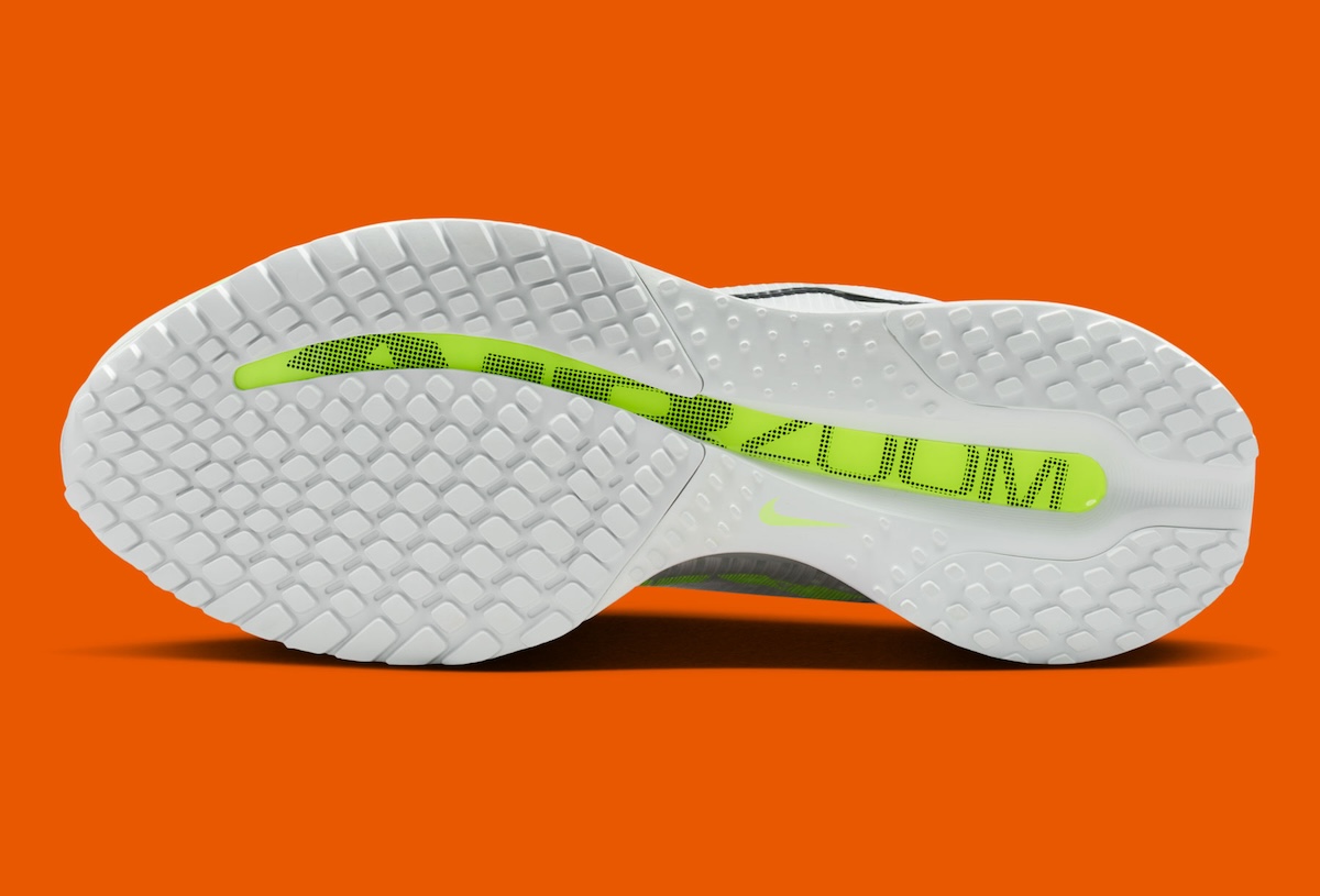The white knit and ripstop upper keeps things sharp, while black Swooshes add contrast without overpowering the base. Volt green accents energize the AIR branding, tongue label, and exposed full-length Air Zoom unit. Meanwhile, orange hits beneath the cushioning quietly nod to Hurricanes heritage. That layered color approach feels deliberate, not loud, allowing the tech to remain the focus.