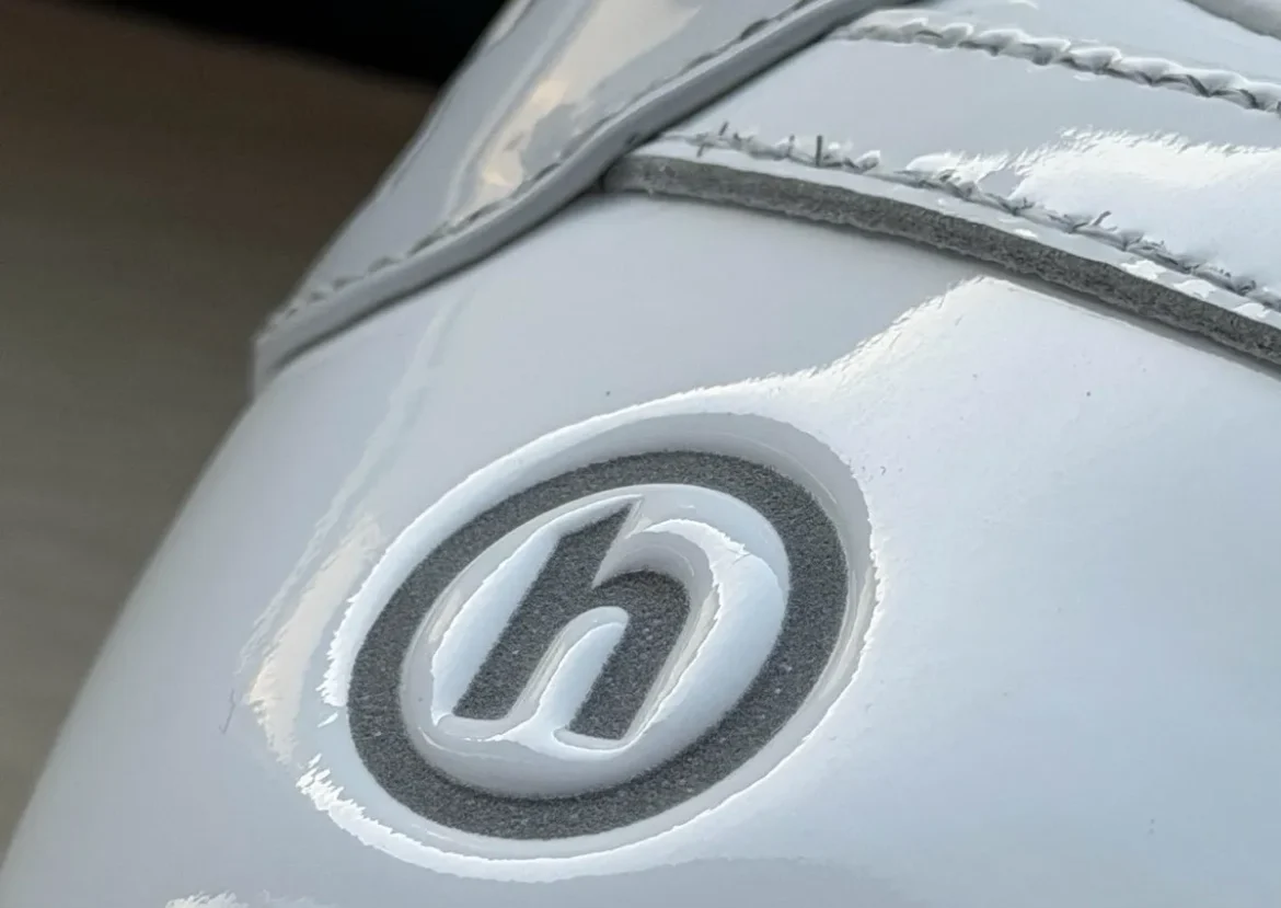Only the lateral heel was shown, but the details carry weight. White patent leather sets a clean foundation, while an embossed circular “h” logo appears in muted grey. That restraint signals polish, suggesting something closer to a retail project than a commissioned custom.