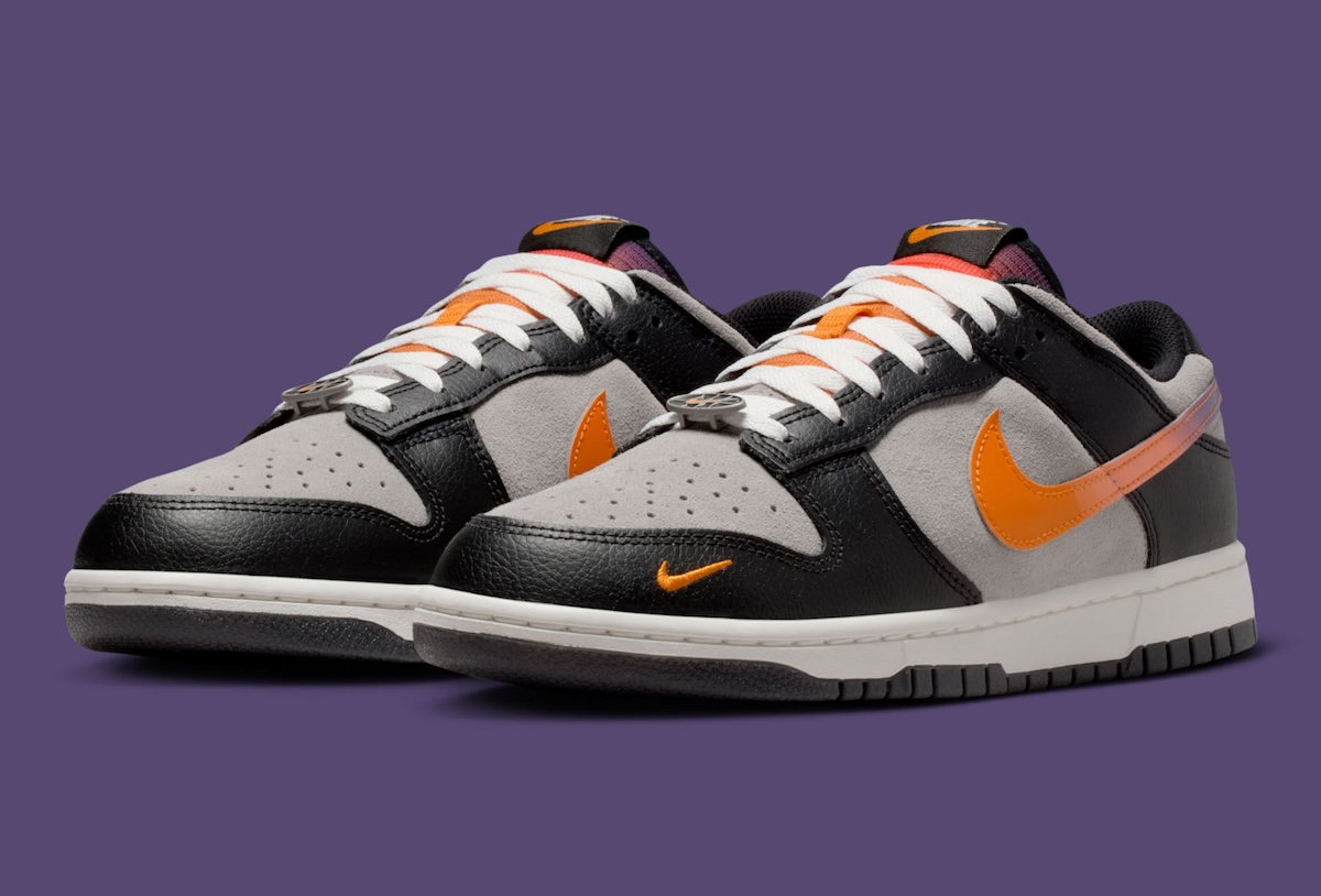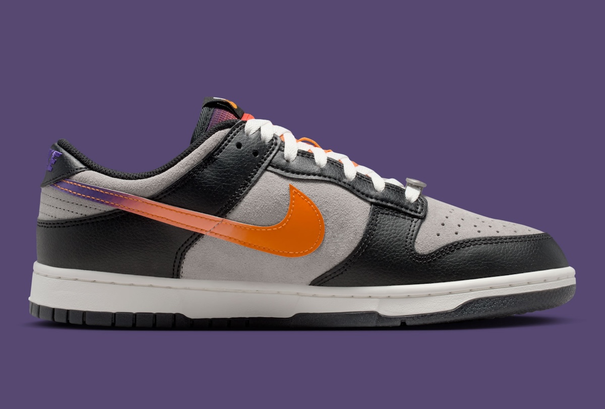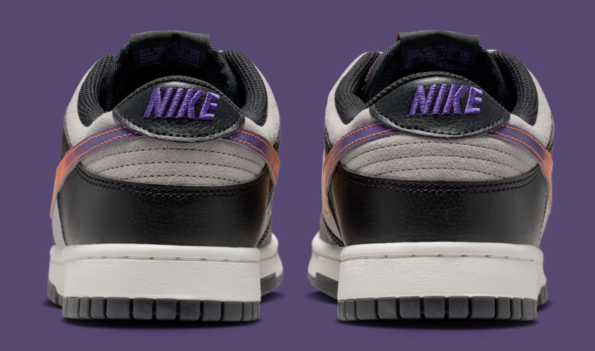 Black leather sets the foundation, while grey suede softens the build without dulling the contrast. Color arrives gradually. Orange hits first, then gives way to a purple fade across the Swooshes, tongue, and insoles. The effect feels deliberate, not loud. Court graphics underfoot and basketball-shaped lace dubraes reinforce the theme without overselling it.