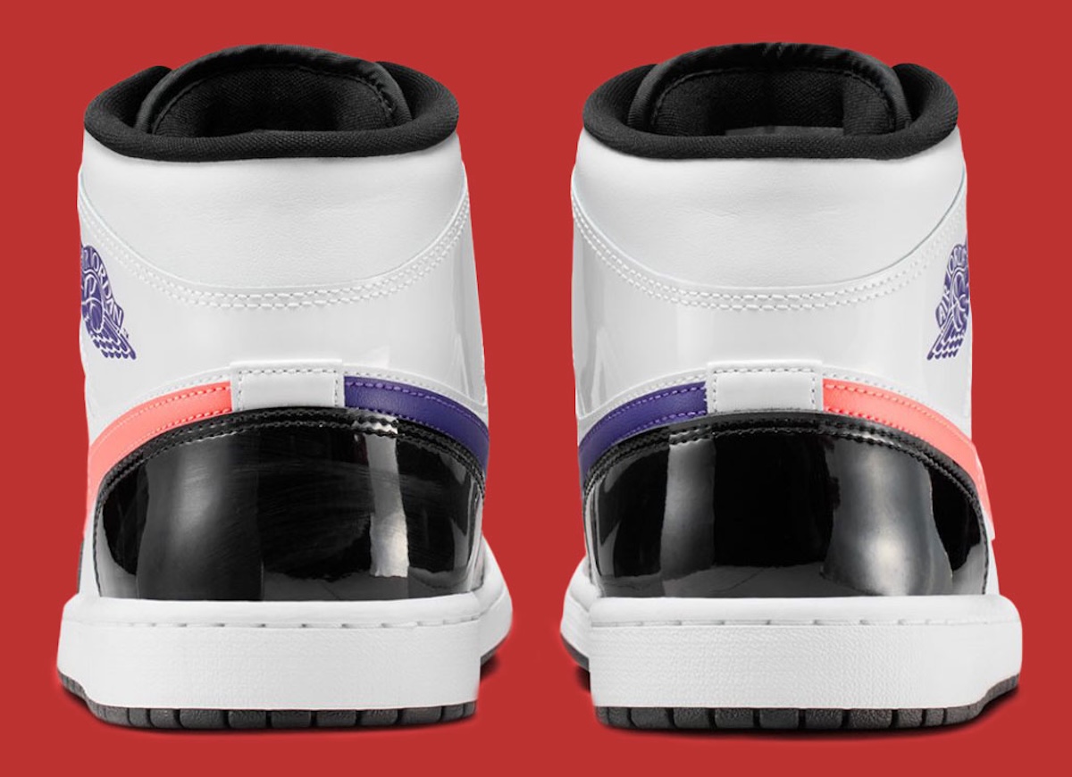 Black patent leather anchors the toe, eyelets, and forefoot, giving the pair a polished, almost dressy edge. Above it, the collar and flap stay white-on-white, a choice that softens the look and breaks from typical Mid formulas.