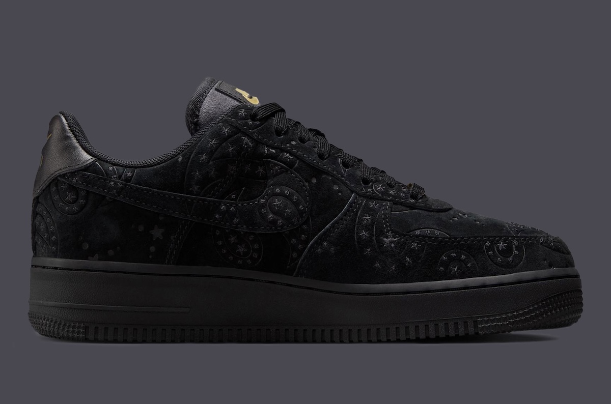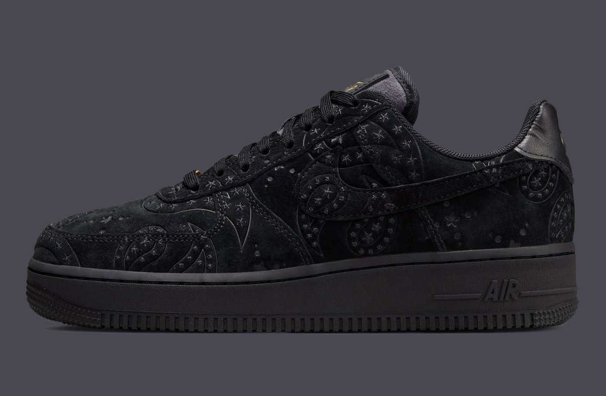 Black suede wraps the upper, pressed with a paisley pattern that runs uninterrupted across panels and Swooshes. Nothing jumps out immediately. That’s the point. Familiar toe perforations stay untouched, anchoring the look in classic Air Force 1 structure.