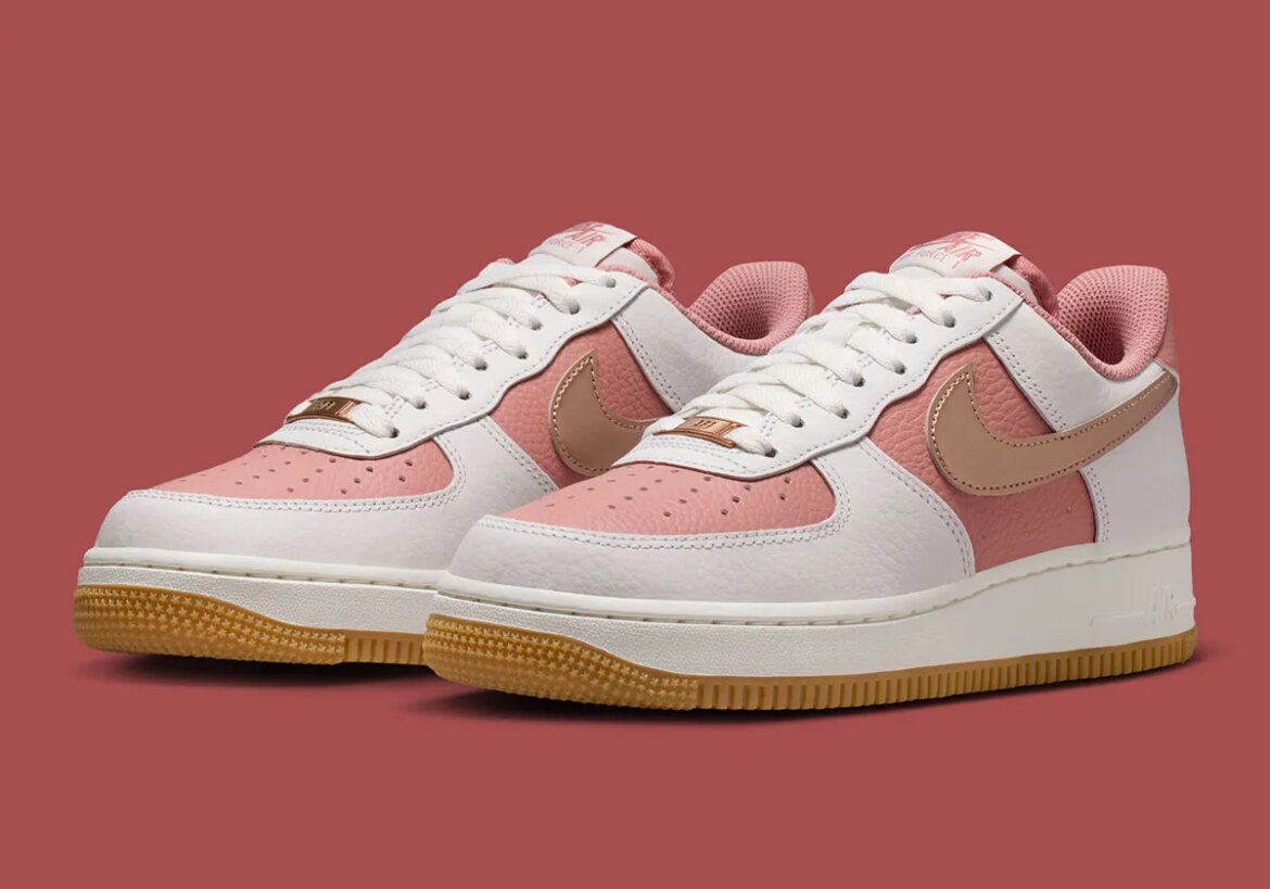 The Nike Air Force 1 Low continues to surface in new styles, here presented in Summit White and Rust Pink with eye-catching Metallic Red Bronze Swooshes.