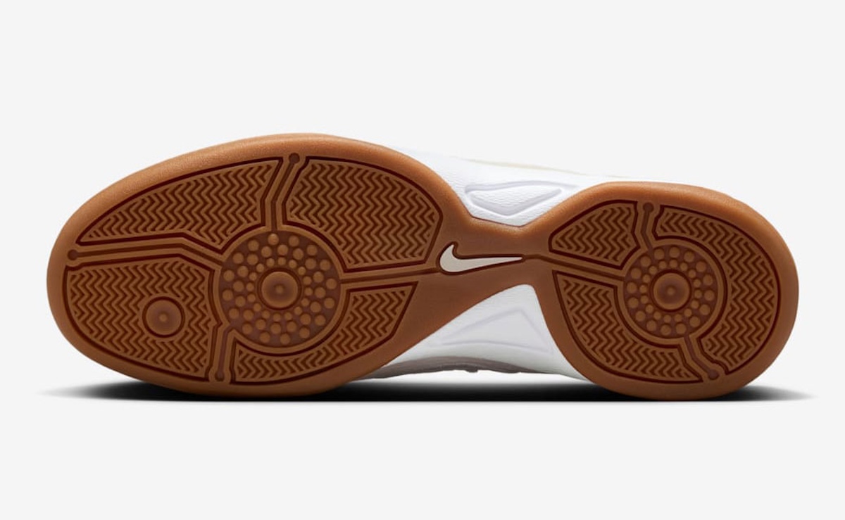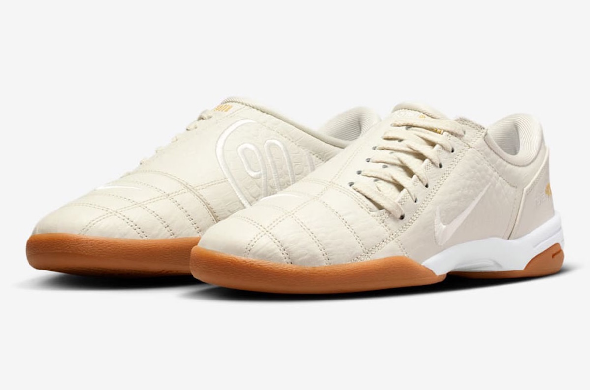By comparison, the Light Bone pair introduces warmth and contrast. A Gum Medium Brown outsole grounds the off-white upper, recalling classic indoor soccer footwear while fitting modern lifestyle rotations.