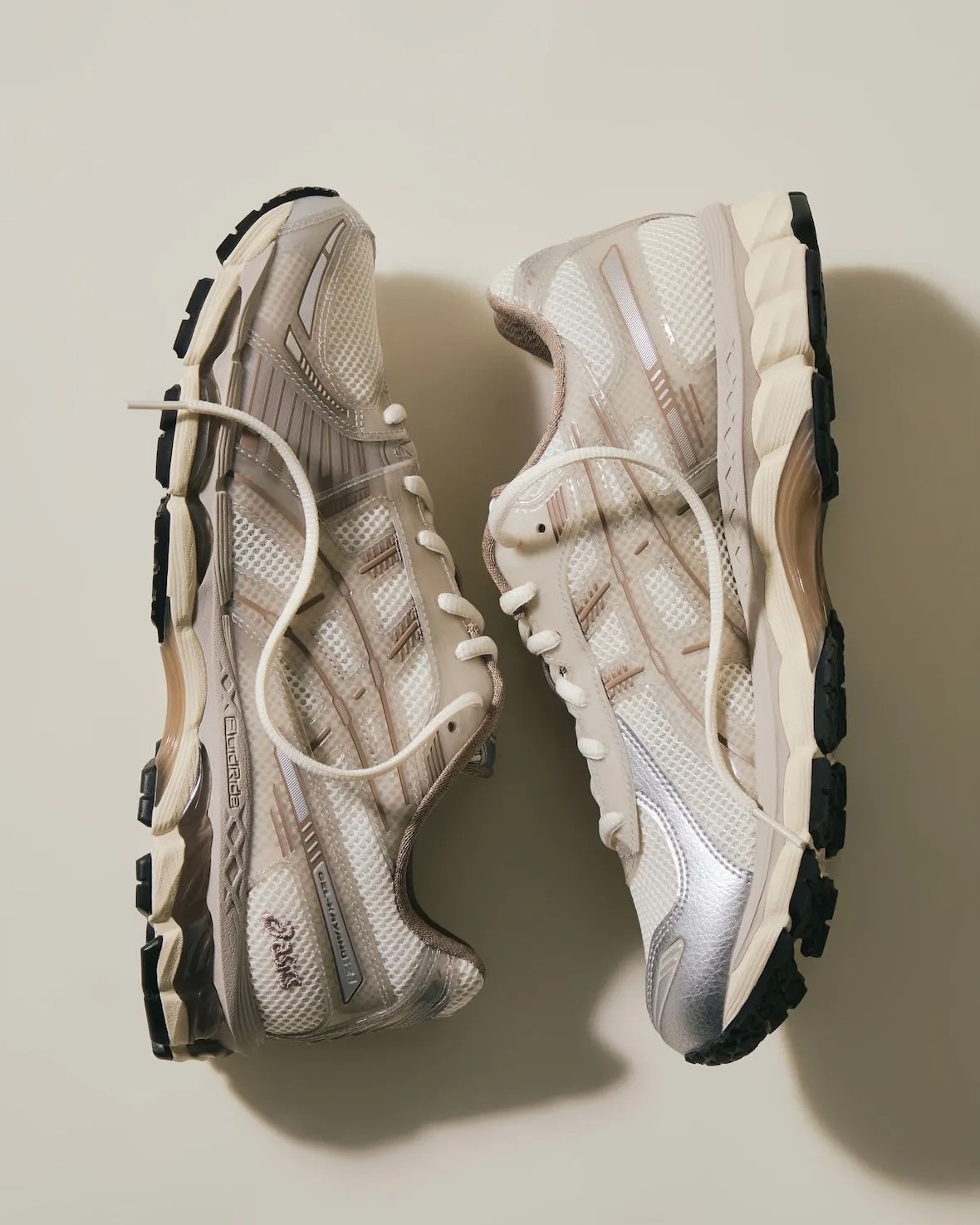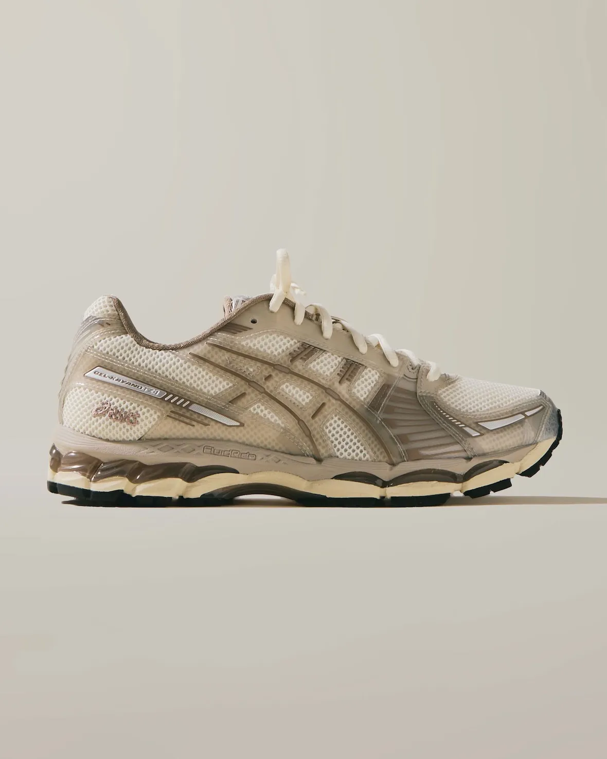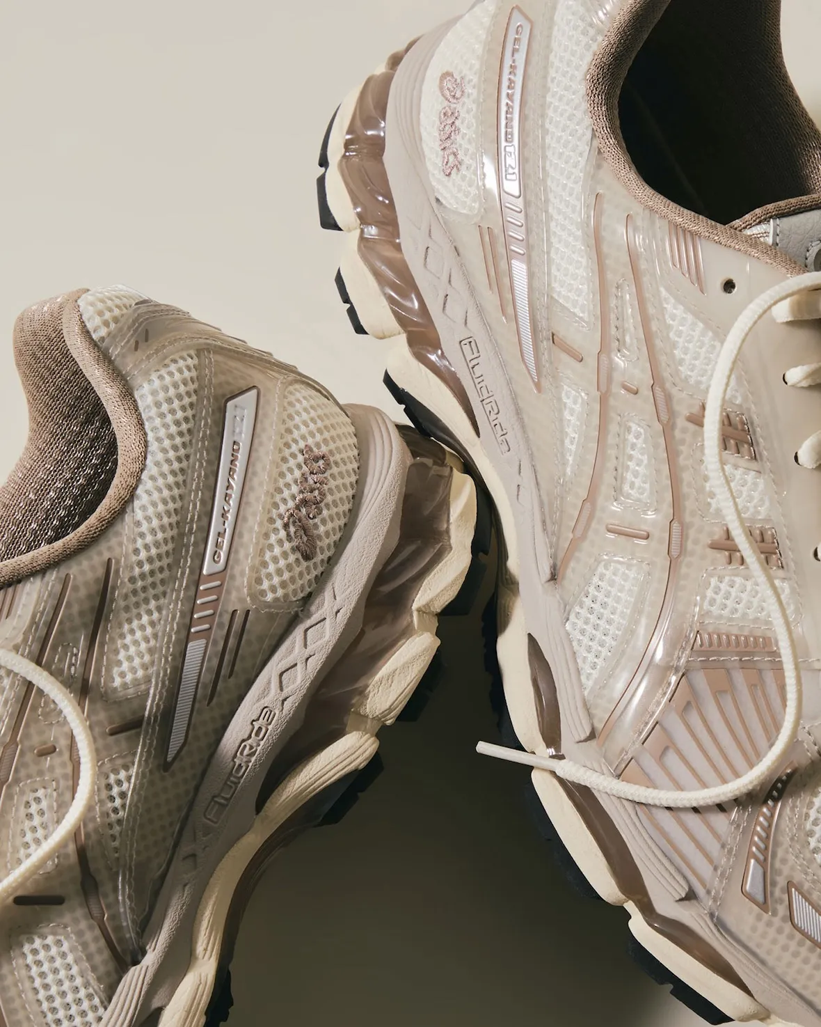 The silhouette choice feels deliberate. KITH helped bring the GEL-Kayano 12.1 sneaker back before its wider ASICS return, giving this moment added continuity. Design execution stays restrained, favoring cream and silver foundations with pastel accents. Subtle brown, soft blue, and muted pink tones flow through translucent overlays and GEL cushioning, keeping the palette wearable.