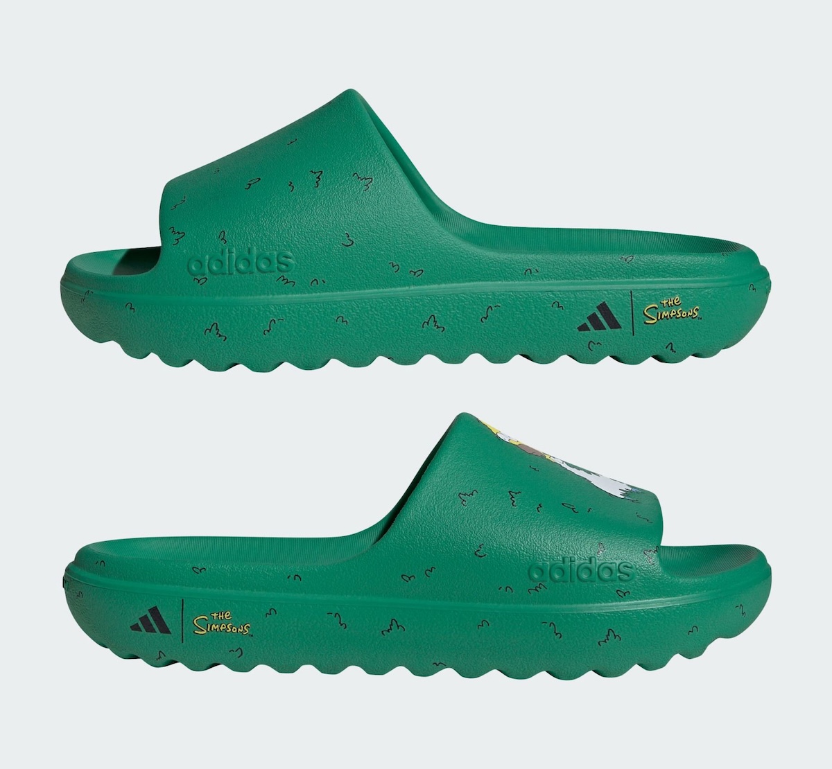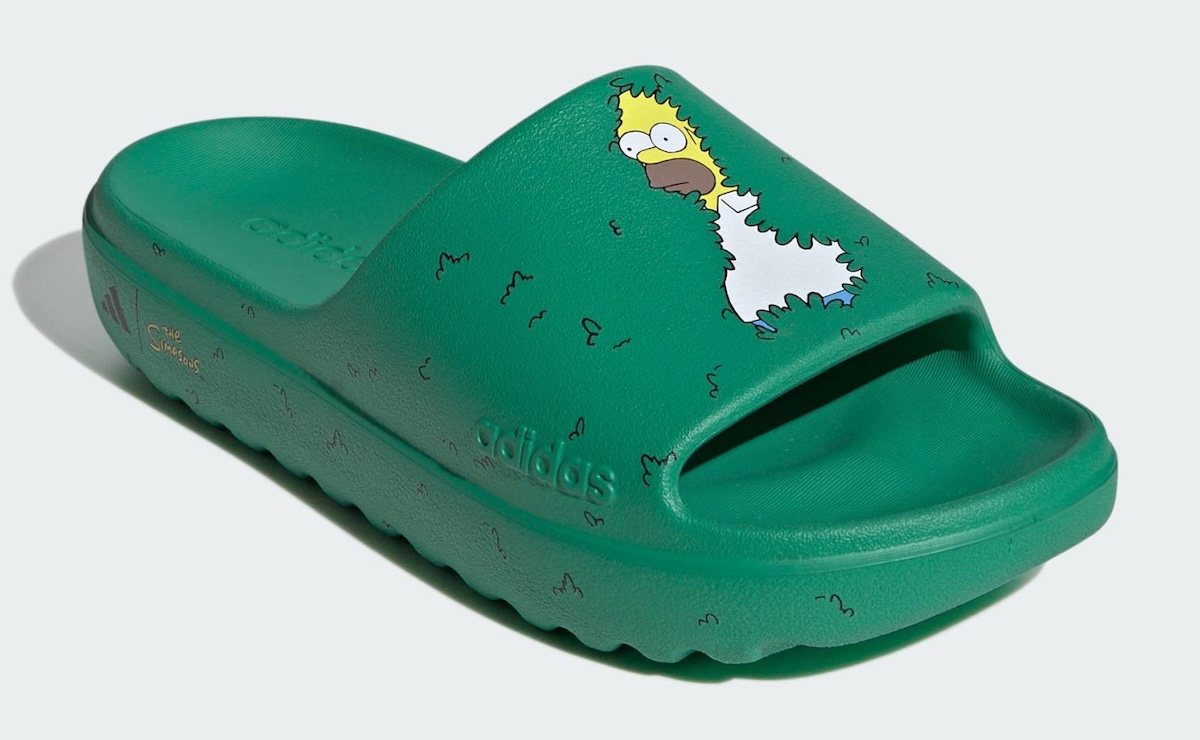 The Homer Simpson Bush Meme x adidas Adilette turns a legendary television moment into wearable pop culture. The green colorway mirrors the hedge scene that made the meme timeless. Instead of forcing novelty, adidas lets the graphic feel natural and playful. As a result, the design feels clever rather than loud.