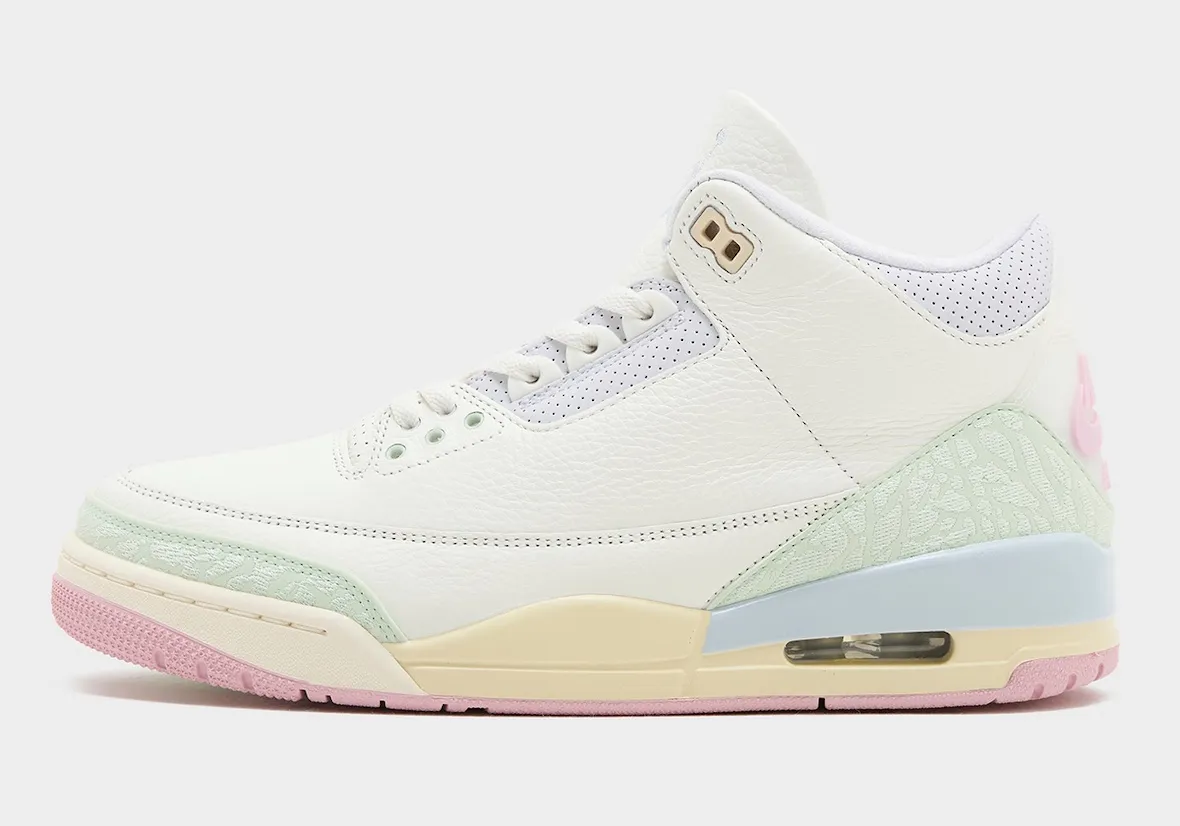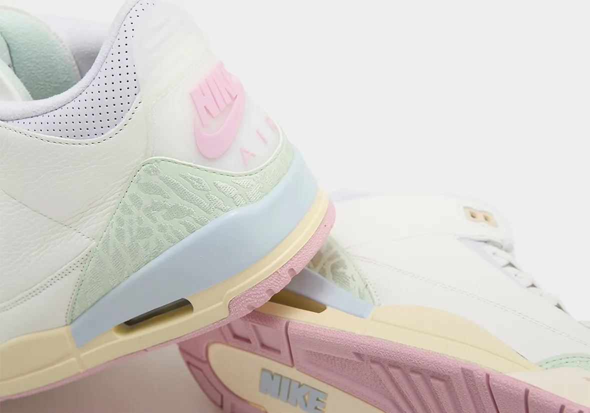 The Air Jordan 3 “Spring is in the Air” is constructed using all-white leather, paired with pastel green, soft blue, lavender, and baby pink accents. A cream midsole rounds out the colorway, adding dimension and extra visual interest. Overall, these hues lean more muted and purposeful than showy, resulting in a cohesive yet expressive finish.