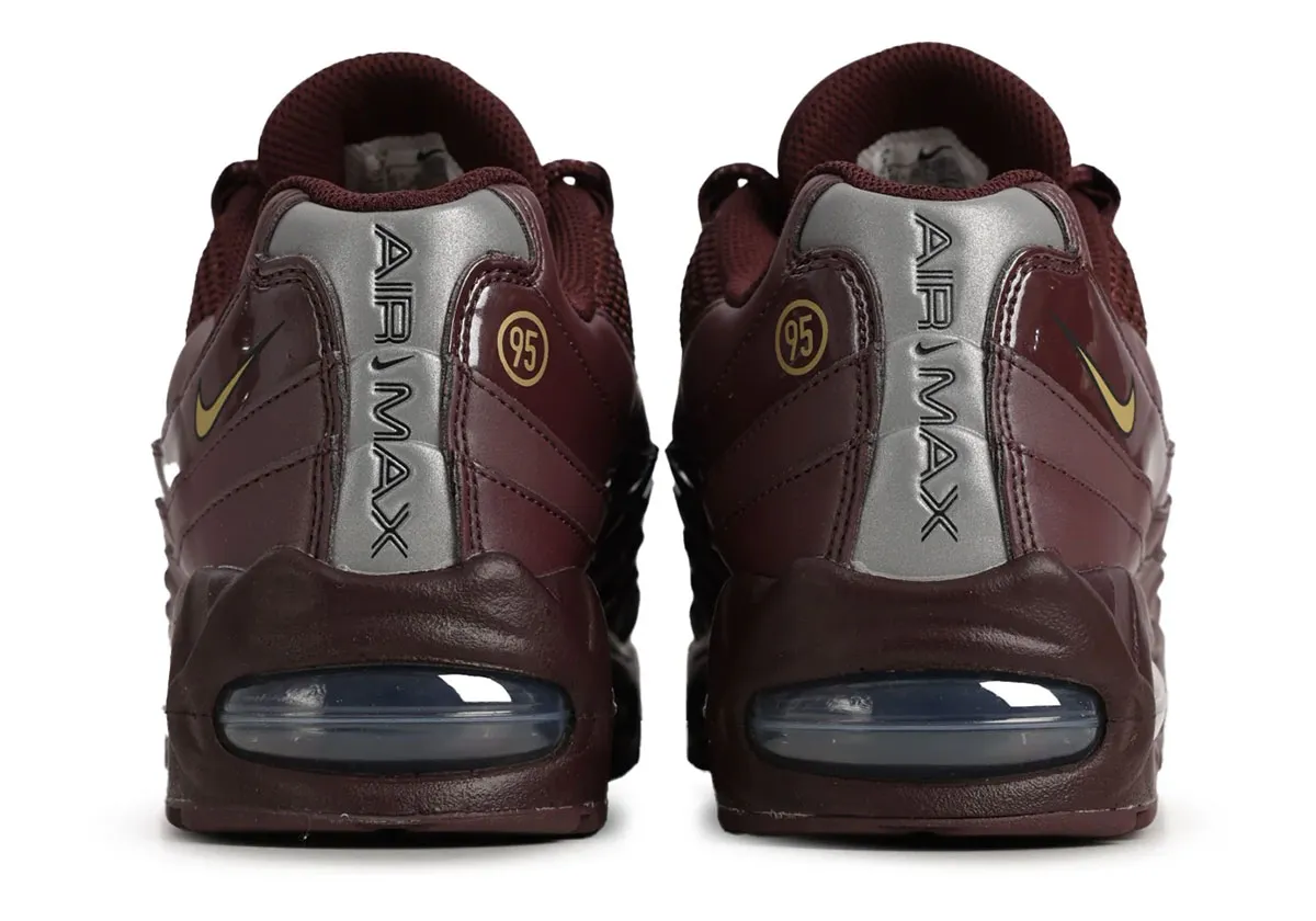 Nike, perhaps noting that overall opinion shift, is hard at work in the forge, playing Frankenstein between beloved existing silhouettes. On top of the introduction of the T90 Shox Magia, the “Big Bubble” Air Max 95 has gotten in on the action in less transformative fashion, pulling from the Total 90 branding and aesthetics for two glossy looks to date. While we await an official release for the black, an all “Burgundy Crush” is coming to light, sharing the patent leather stripe down the sidewalls and reflective hits at the heel. Of course, the true hallmark of this crossover event is still in place, as encircled 90 brands appear on the tongue and the medial heel.