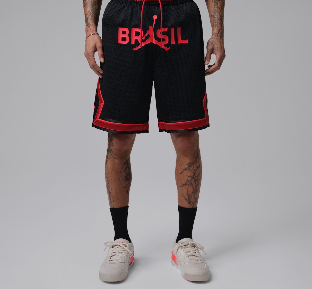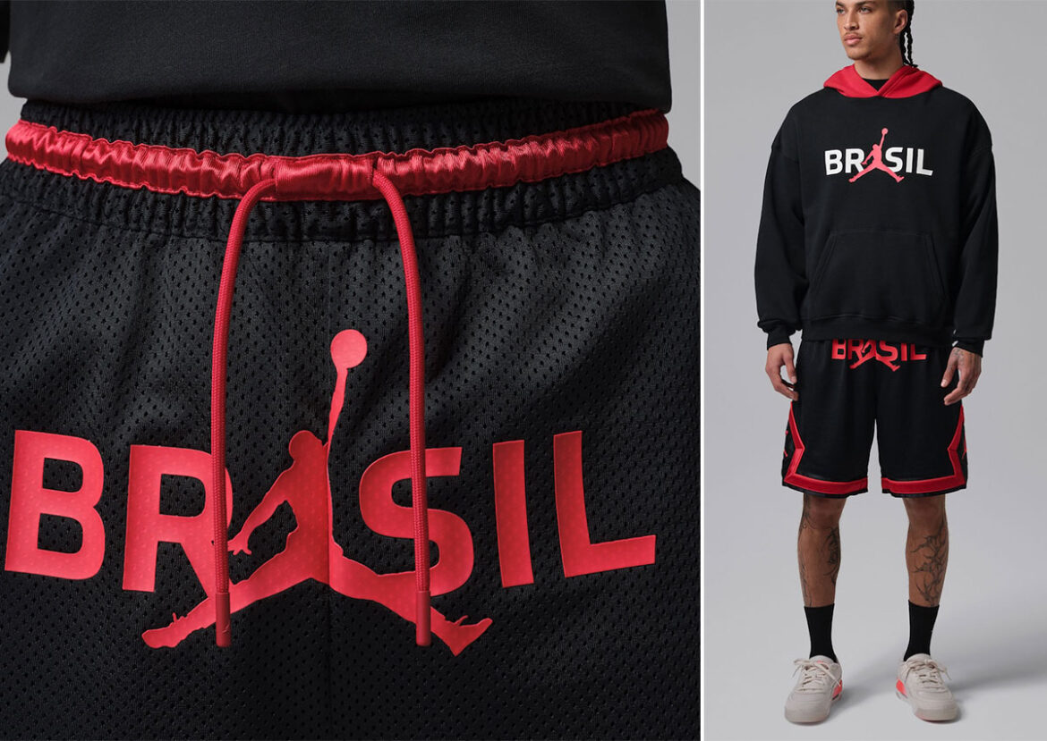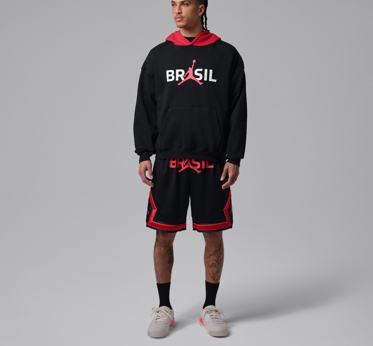 The black and red palette subtly recalls Chicago heritage while fitting Brazil’s bold visual identity. Hoodies and mesh shorts add character by swapping the “A” in “Brasil” with the Jumpman, a graphic move that reads confident and controlled.