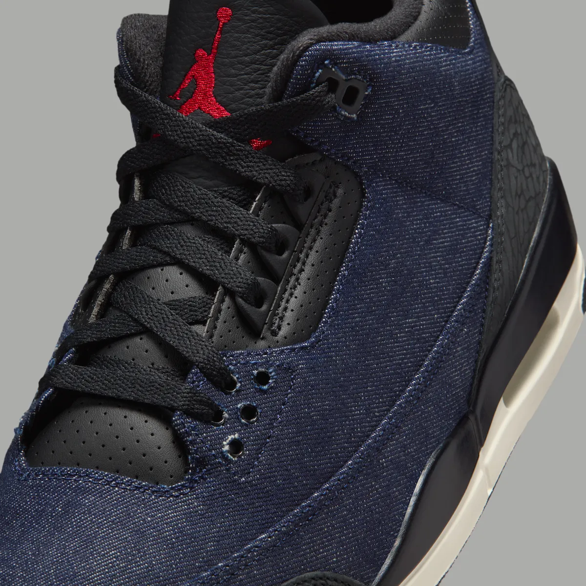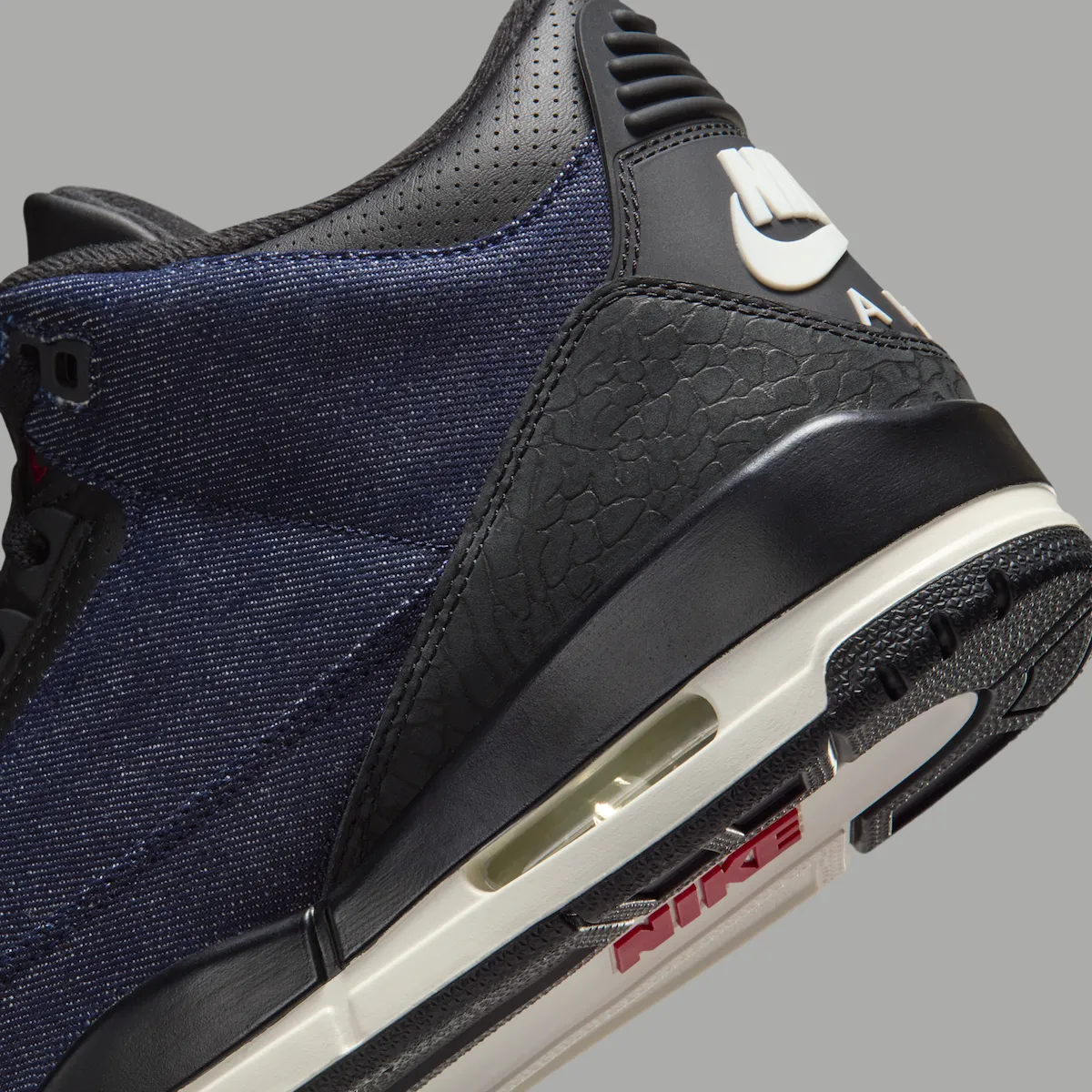 Dark denim wraps the panels with a texture that will age naturally over time. That detail alone gives the shoe personality from the start. Meanwhile, black elephant print anchors the toe and heel, preserving the Jordan 3s iconic identity. It is a balance between heritage and material storytelling.