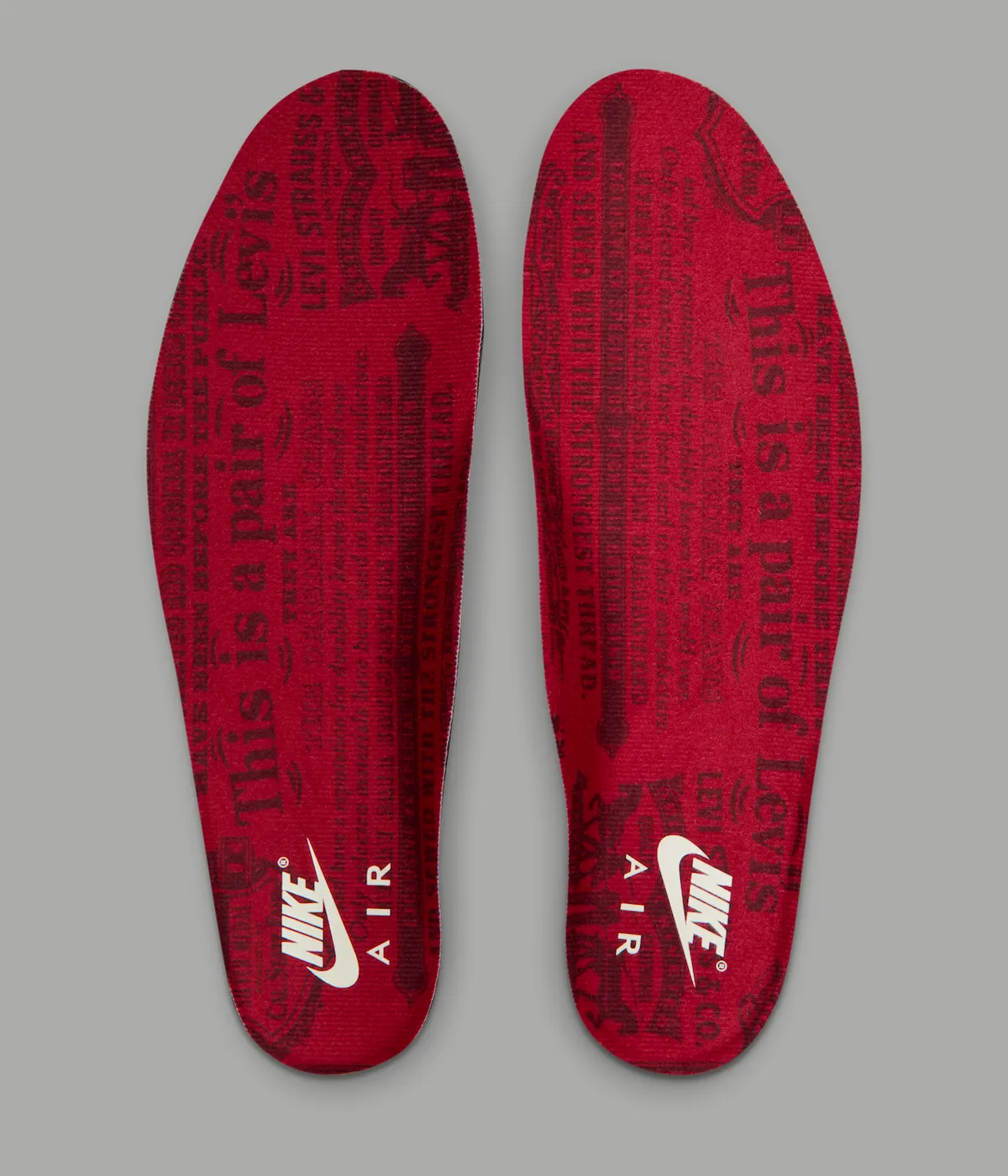 At the heel, classic Nike Air branding reinforces the retro appeal. The red Levi’s hangtag becomes the focal accent, referencing the famous 501 pocket label. It adds authenticity without feeling decorative or forced.