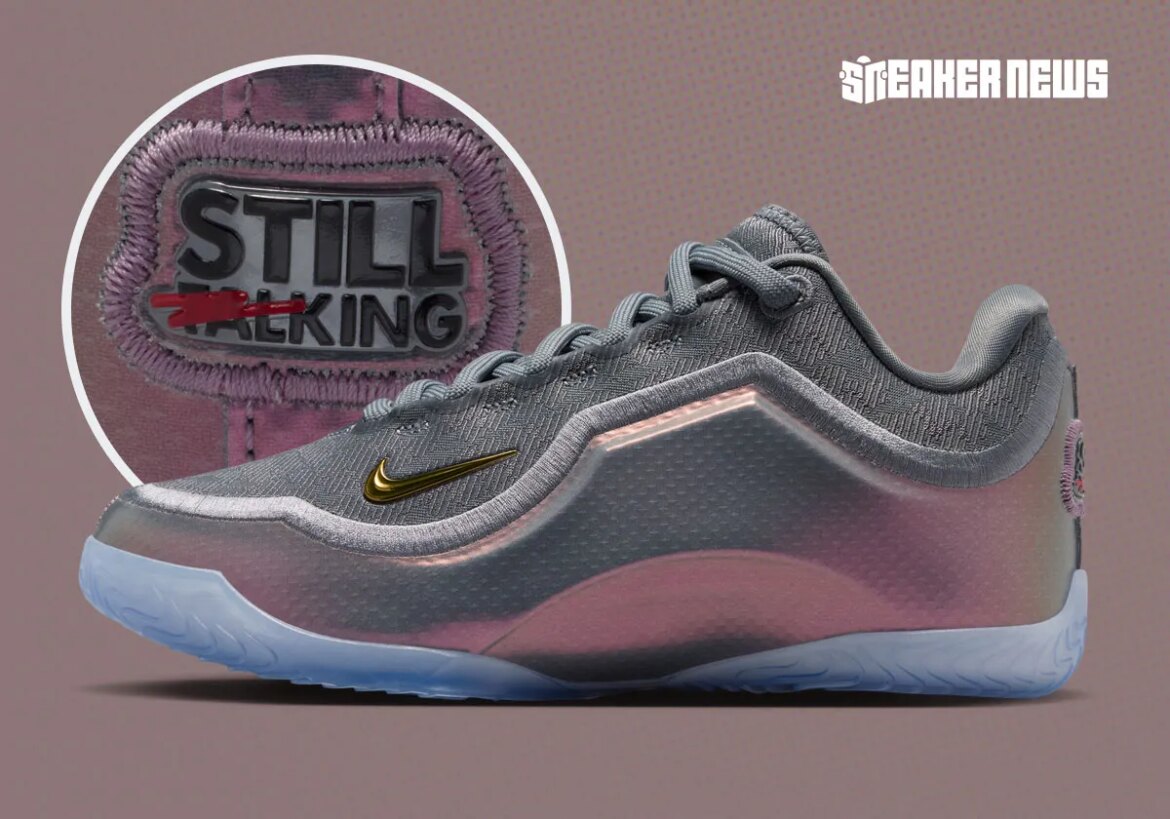 The gallery below shows a mostly grey colorway featuring a textured fabric upper and a steel grate pattern on the crown. The real highlight lives on the heel, where Nike includes text reading “Still Talking,” with letters crossed out to read “Still King.” Semi-translucent blue outsoles cap off the design underfoot.