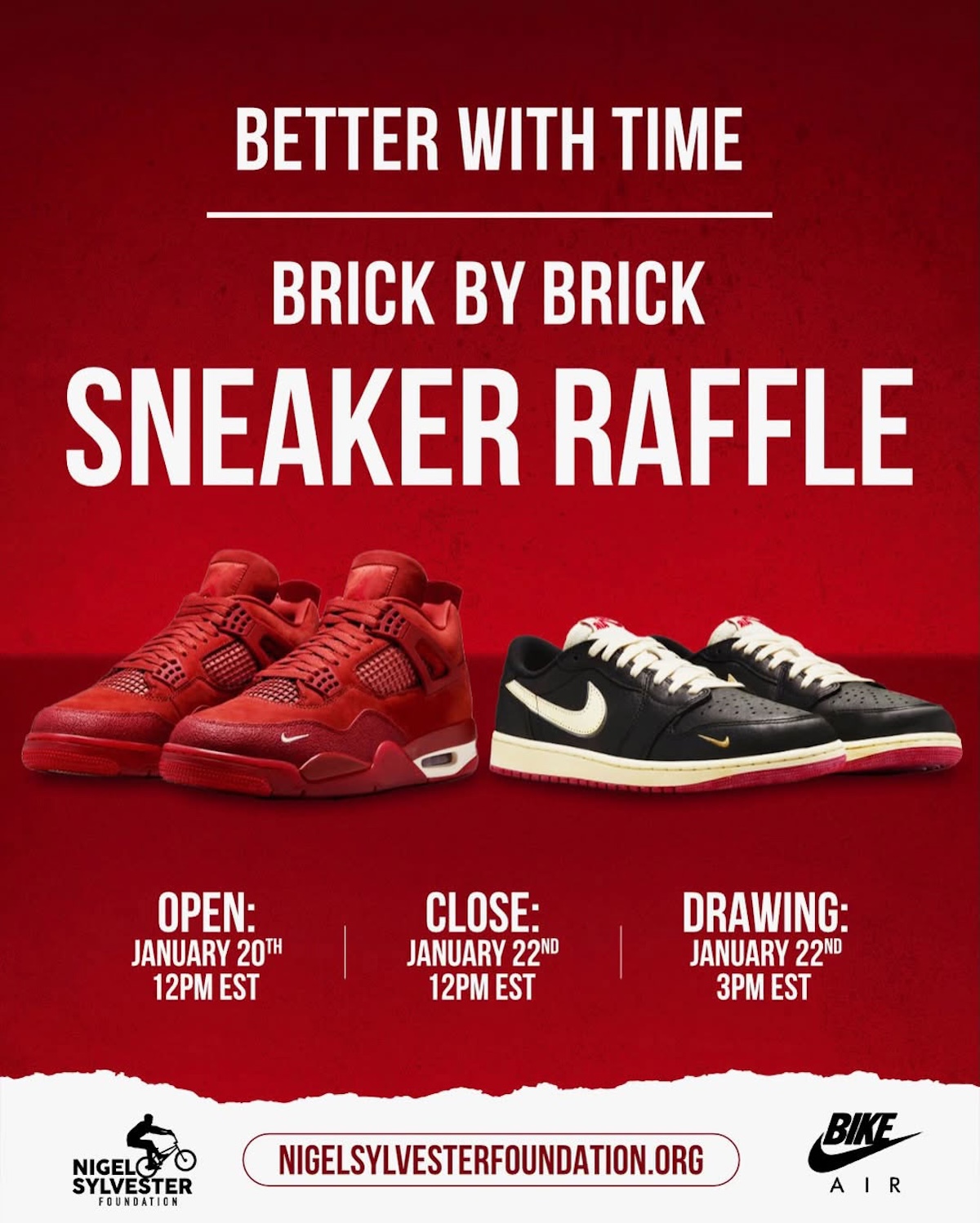 Nigel Sylvester is turning two of his most talked-about Jordan releases into something that actually gives back. Instead of another standard giveaway, he’s using the moment to support the work behind his foundation. Three winners will walk away with both the Air Jordan 4 “Brick by Brick” and the Air Jordan 1 Low OG “Better With Time,” making this one of his most meaningful drops yet.