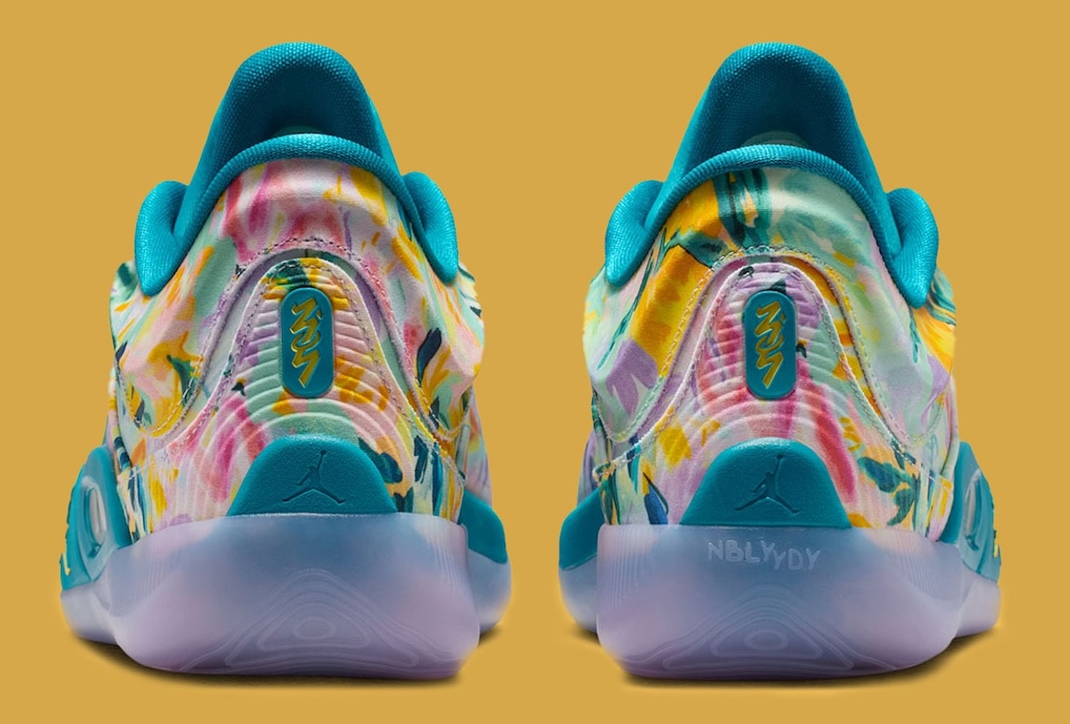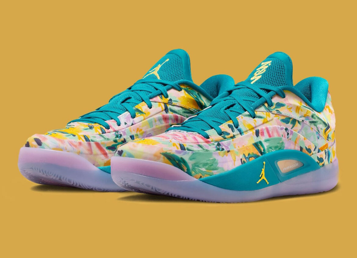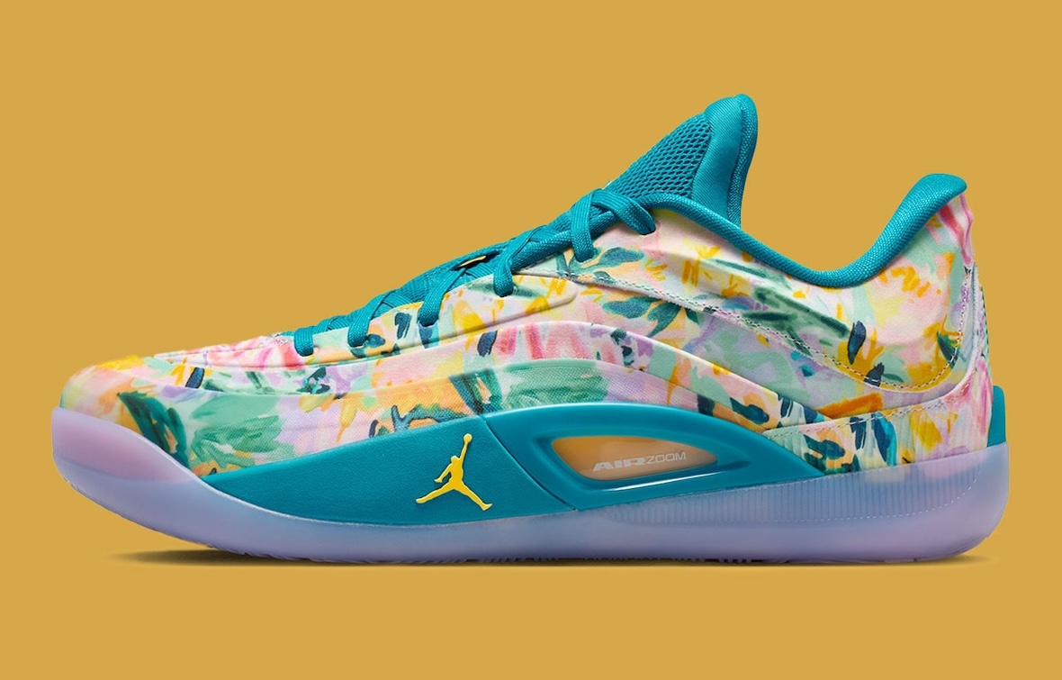 The sculpted leather upper features a floral print that feels closer to lifestyle design than traditional performance basketball. Tropical Teal panels frame the build, while Citron Pulse branding adds sharp contrast. It follows Jordan Brand’s recent shift toward expressive color stories, similar to past Zion editions that blurred sport and street appeal.