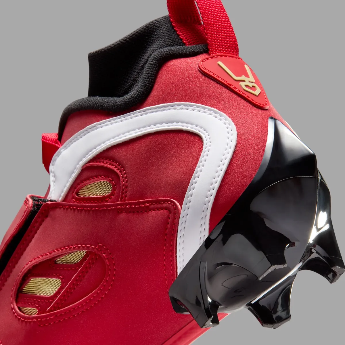 The Prime Red upper sets a commanding tone while giving the football cleat a premium finish. White overlays cut through the midfoot and heel, keeping the silhouette sharp and defined. Metallic Gold mesh adds depth and a subtle nod to the original Diamond Turf styling.