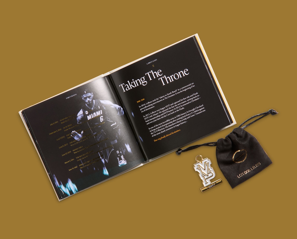 Careful balance is also evident in the upper’s construction. Textured knit allows for breathability while smooth, suede-like overlays provide tension and longevity. Gold-toned Swoosh branding and accent tongue badge polish it off, while the embossed MP logo stamping on the heel is a direct reference to LeBron’s MVP achievement.