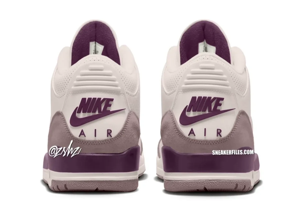 At the center of this release is a design meant to feel refined without drifting too far from the model’s roots. Early mock-ups point to a white upper paired with a purple-toned heel and grey detailing where the elephant print usually sits. While those visuals aren’t final, they suggest a cleaner, softer direction that still respects the structure that made the Air Jordan 3 iconic.
