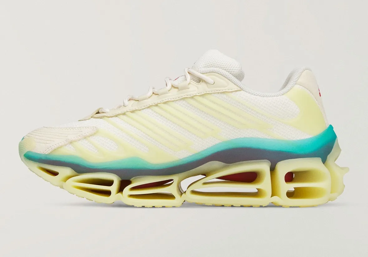 At the center of this release are two colorways, Black and Cream, both pushing the Megaride platform into new visual territory. The Black version leans aggressive with silver metal mesh, translucent overlays, reflective hits, and red foam accents beneath the sole. Meanwhile, the Cream pair softens the tone with light mesh, suede details, matte branding, and subtle red contrast on the outsole.