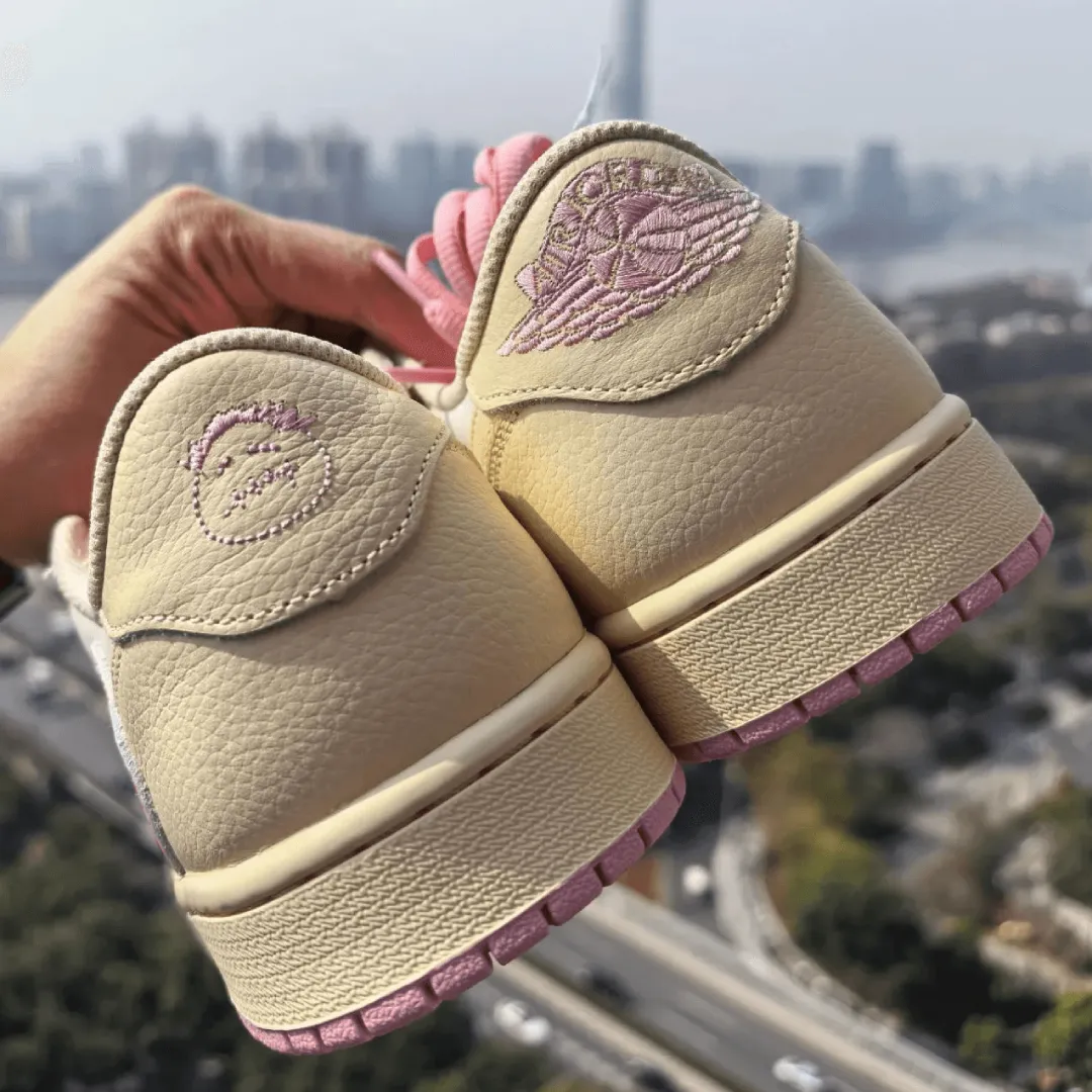 At the center of it is the Travis Scott x Air Jordan 1 Low OG “Muslin/Shy Pink”, a colorway that balances simplicity with identity. Creamy muslin leather wraps the toe, laces, heel, and inner Swoosh, adding texture without overpowering the design. Meanwhile, clean white leather panels keep the upper grounded and versatile.