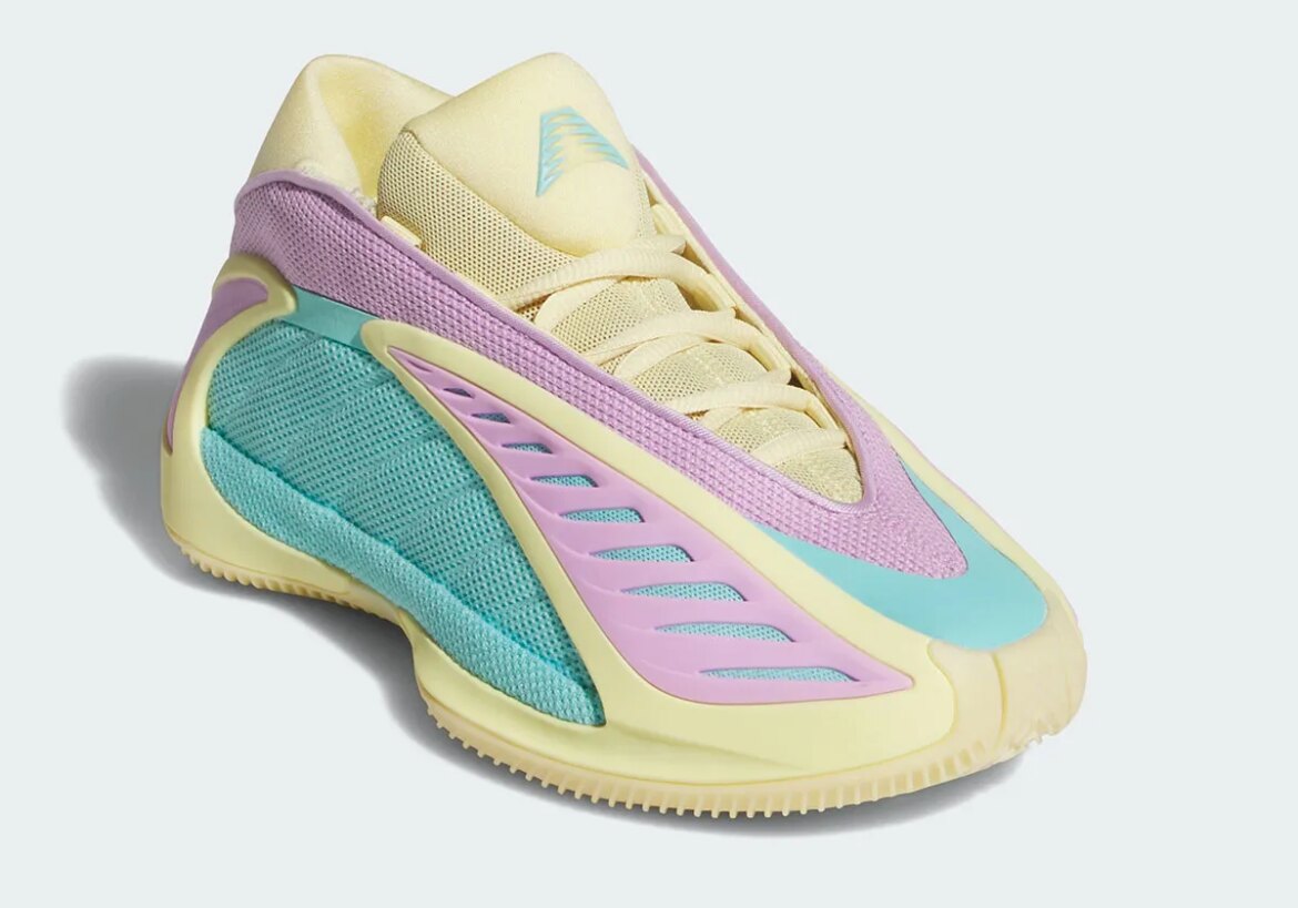 Indeed, “Almost Yellow” trim down the tongue and in the synthetic anchoring pairs with “Bliss Lilac” within the vents and collar trim before splaying into “Flash Aqua” across the actual siding of the shoe. All of that screams “Easter,” leaving this pair as an easy one to parse visually. However, this does align with a growing movement within the silhouette’s run overall. Jumping from the adidas Anthony Edwards 2 “Multicolor” into this one demonstrates how the German giant’s designers have pushed beyond the monochromatic and two-tone fare that defined the AE1 overall and this model’s early run, finally seeing Edwards’ infectious off and on-court personas get the kicks to match.