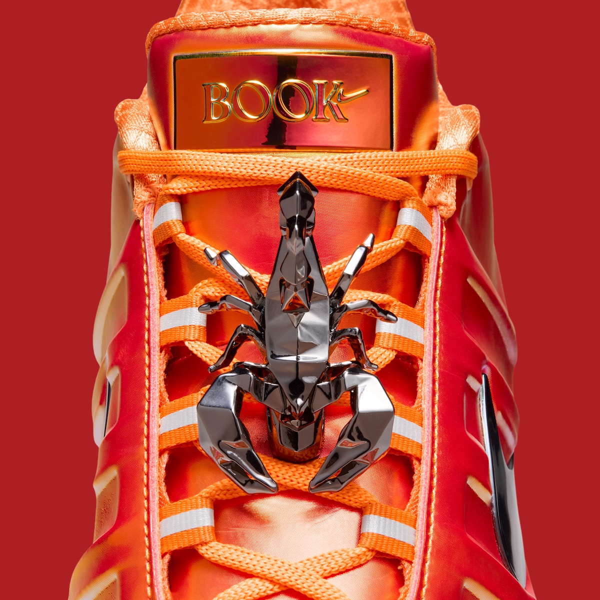 The palette ties directly to place. Orange anchors the shoe to Phoenix, while scorpion references speak to Devin Booker’s zodiac sign. That connection shows up most clearly through the sculpted scorpion lace jewel, which immediately separates this version from standard Book 2 releases.