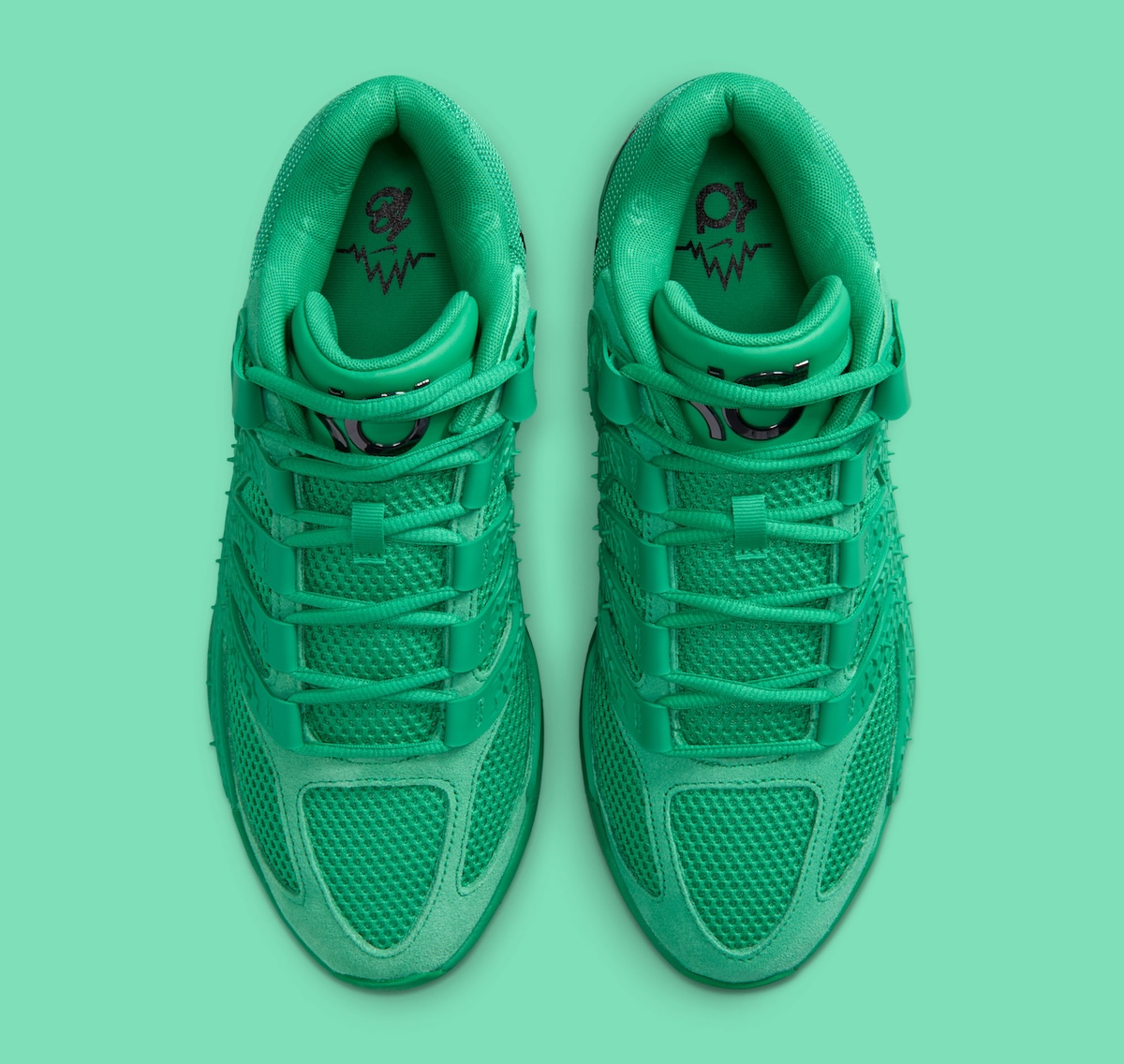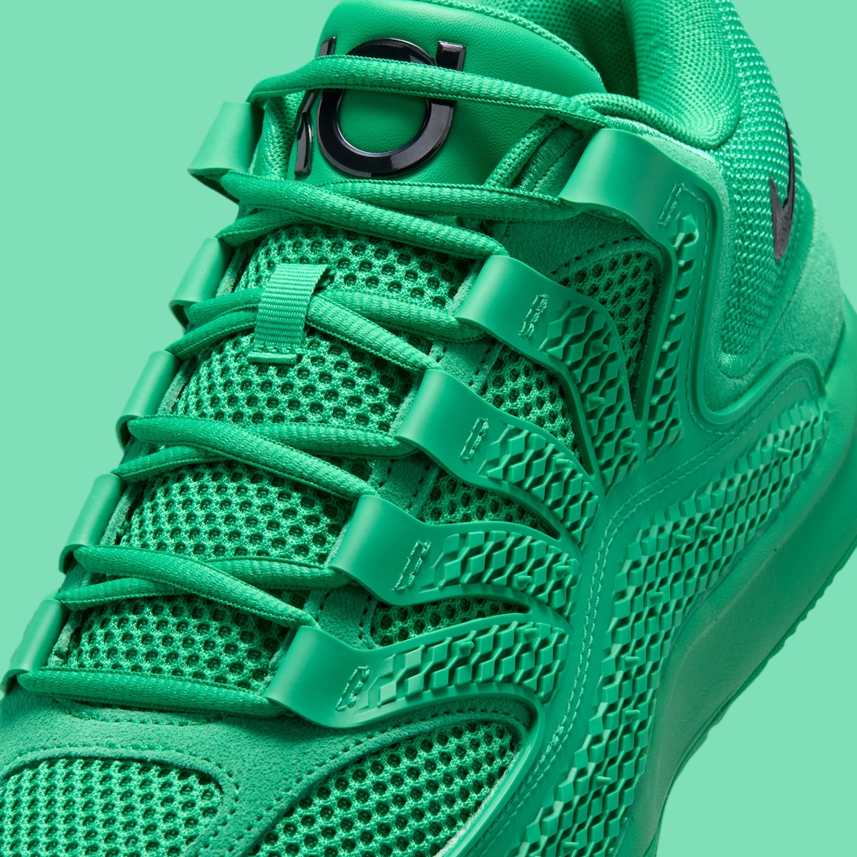 Slathered in a vivid mix of Stadium Green and Black, the Nike KD 18 “Stadium Green” silhouette allows the details on the shoe to speak for itself. Green mesh provides ventilation on the upper while suede overlays are used to strengthen areas around the toe and heel. Surrounding your foot is a sculpted midfoot cage adorned with dimensional geometric patterns for added restraint and technical style.