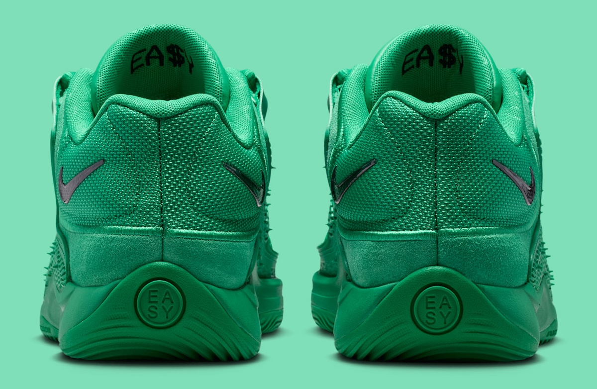 Branding remains measured. A glossy black Swoosh lands on the lateral heel, with smaller rear hits keeping things balanced. “EASY” text stitched along the inner collar nods to Durant’s scoring mentality without overstatement.