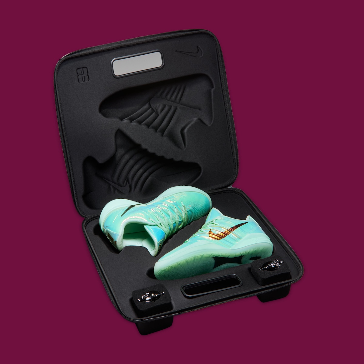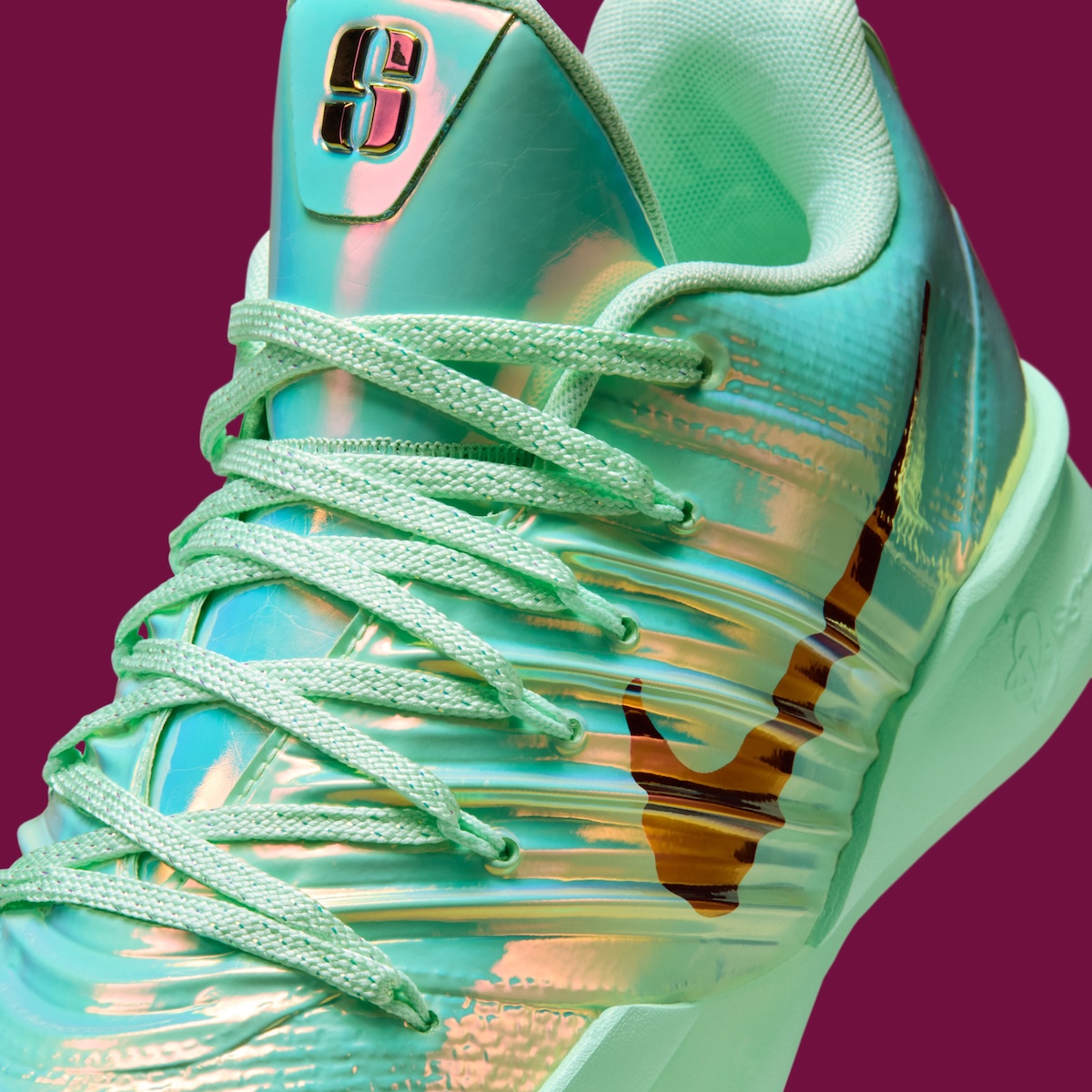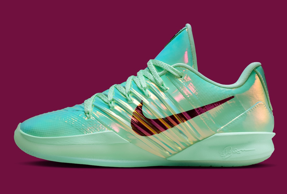 Material choice drives the update. The upper trades its standard performance build for a glossy, iridescent shell that changes with movement and light. Sculpted paneling remains clean and uninterrupted, placing the finish front and center.