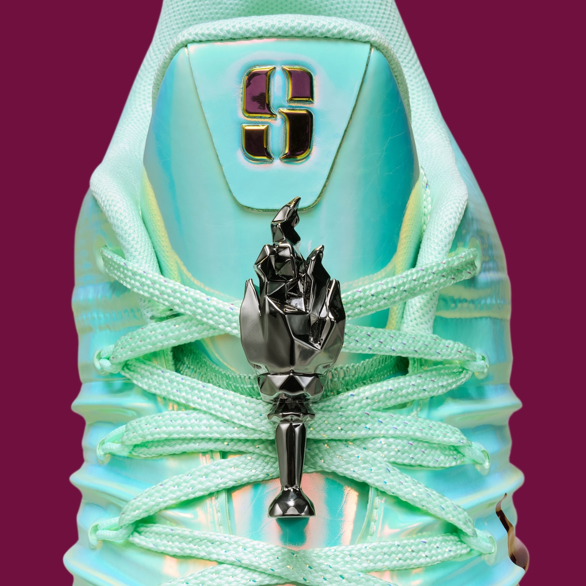 Logo-wise things remain minimal. A blacked out Swoosh tattoos across the sidewalls and Sabrina’s branding rests discreetly on the tongue and heel. Only an enamel lace jewel inspired by Liberty Torch inserts the clearest thematic statement, nodding back to her franchise without overwhelming the shoe.