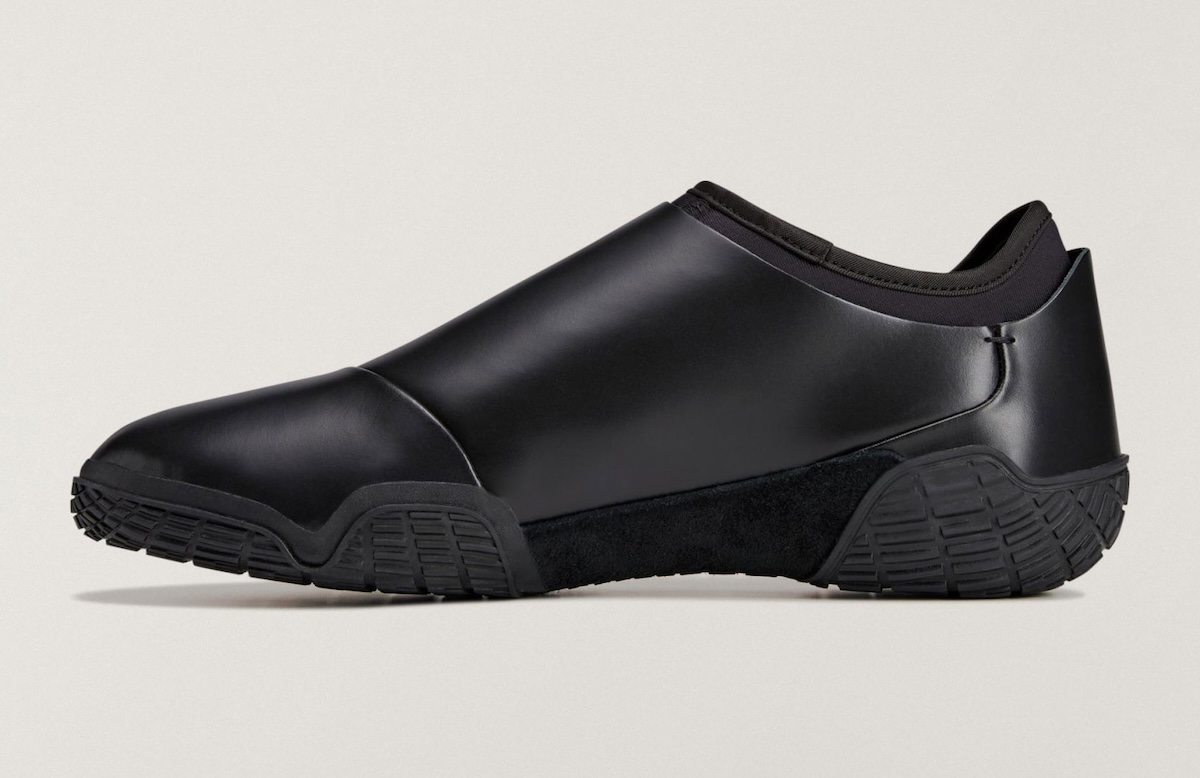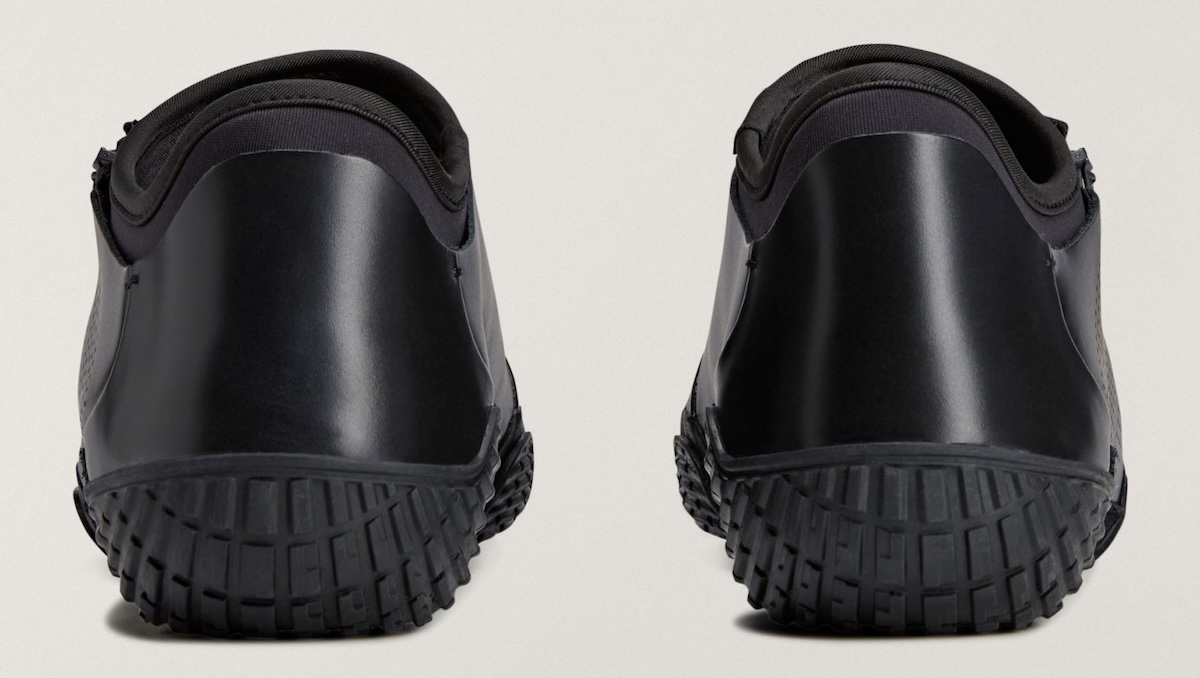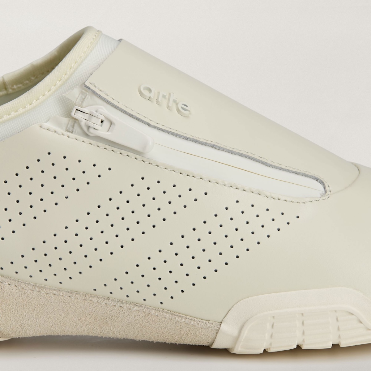 On top, suede jackets smooth out the upper without feeling overly slick. Centered along the interior panel, a zip adds ease of entry and provides a strong graphic element. The collar extends up higher around the ankle and flairs inward, gripping closer to the foot like a sock. Small holes are then punched along the midfoot for texture and contrast, while a piece of suede running down the shank mitigates some of the gloss.