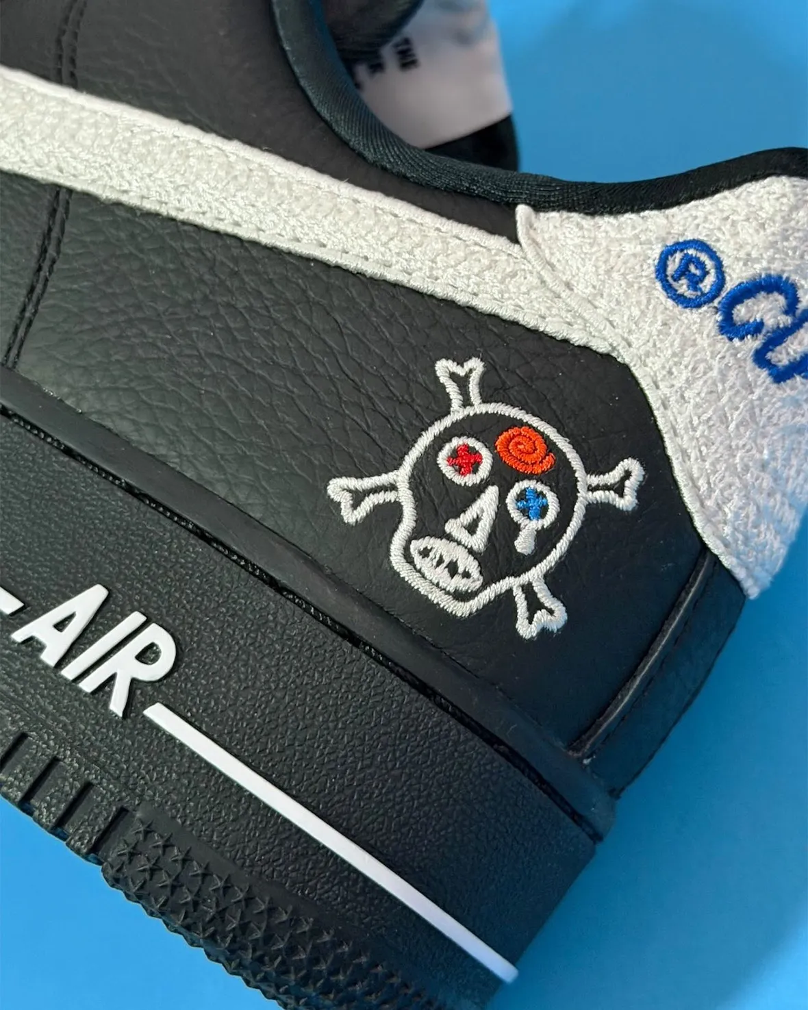 Black tumbled leather carries the upper with crisp white Swooshes cutting across the side panels, keeping the base clean and unmistakably AF1. A woven heel tab replaces the usual smooth panel, while Patterson’s stitched skull sits on the rear quarter with his name embroidered just above it, blending personal iconography into a classic silhouette without overwhelming it. The familiar all-black midsole and outsole keep the design grounded, letting the back-panel details do the talking.