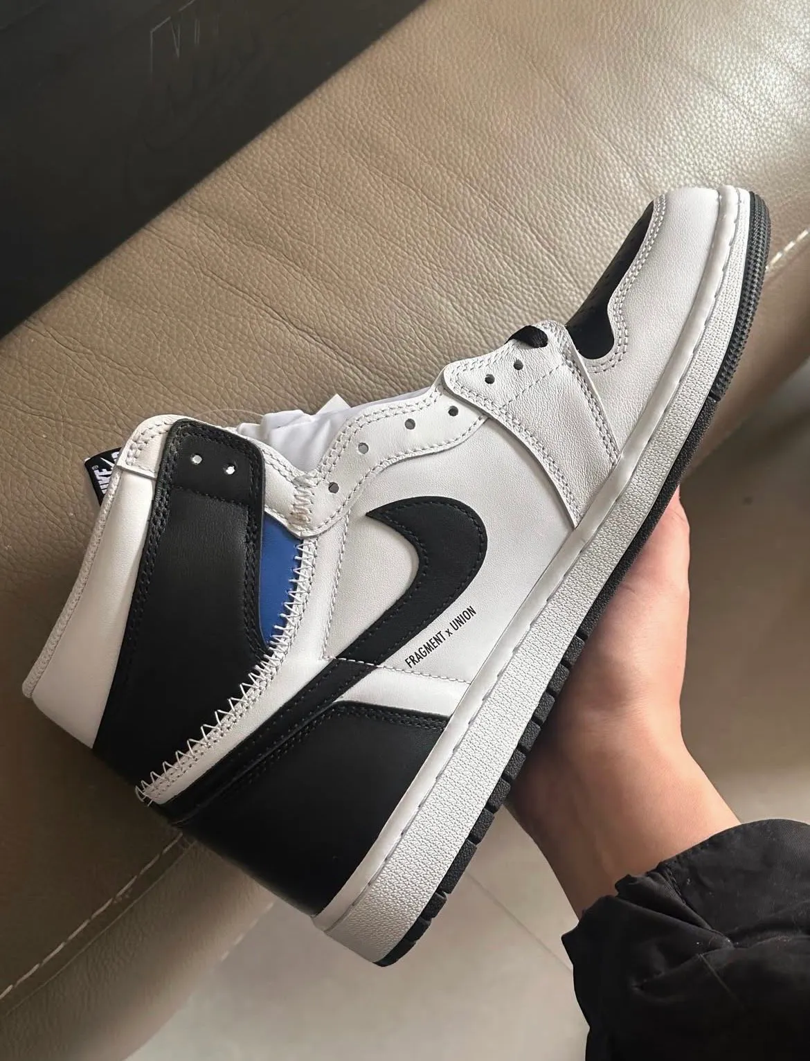 Clean white leather forms the base, while matte black overlays frame the toe, eyestays, and collar in a way that echoes classic 1985 blocking without mimicking it. Exposed zigzag stitching along the collar and heel introduces Union’s signature hand-touched aesthetic, adding texture without disrupting the silhouette’s balance. A small Fragment lightning bolt on the heel quietly anchors the collaboration rather than shouting it.