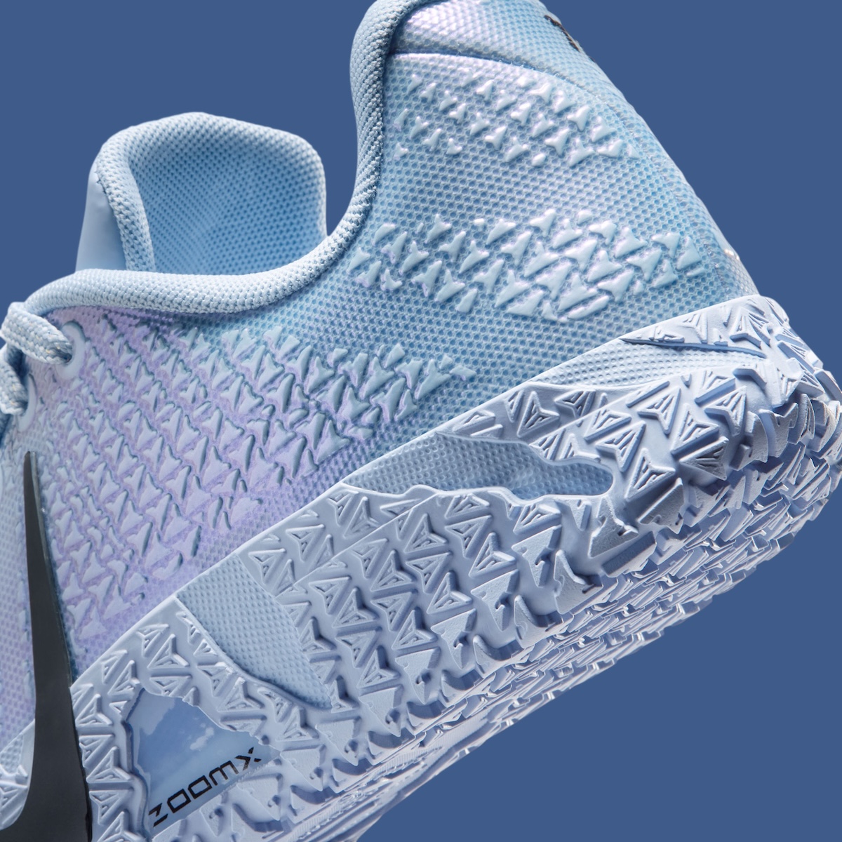 This Cobalt Bliss foam builds up underfoot around a framed ZoomX window that’s visible near the midfoot. Triangular dots pack tightly together throughout the outsole suggesting quick stops and starts that the shoe intends to deliver. Printed discreetly across the heel is “TEMPO” in a darker blue hue for good measure.
