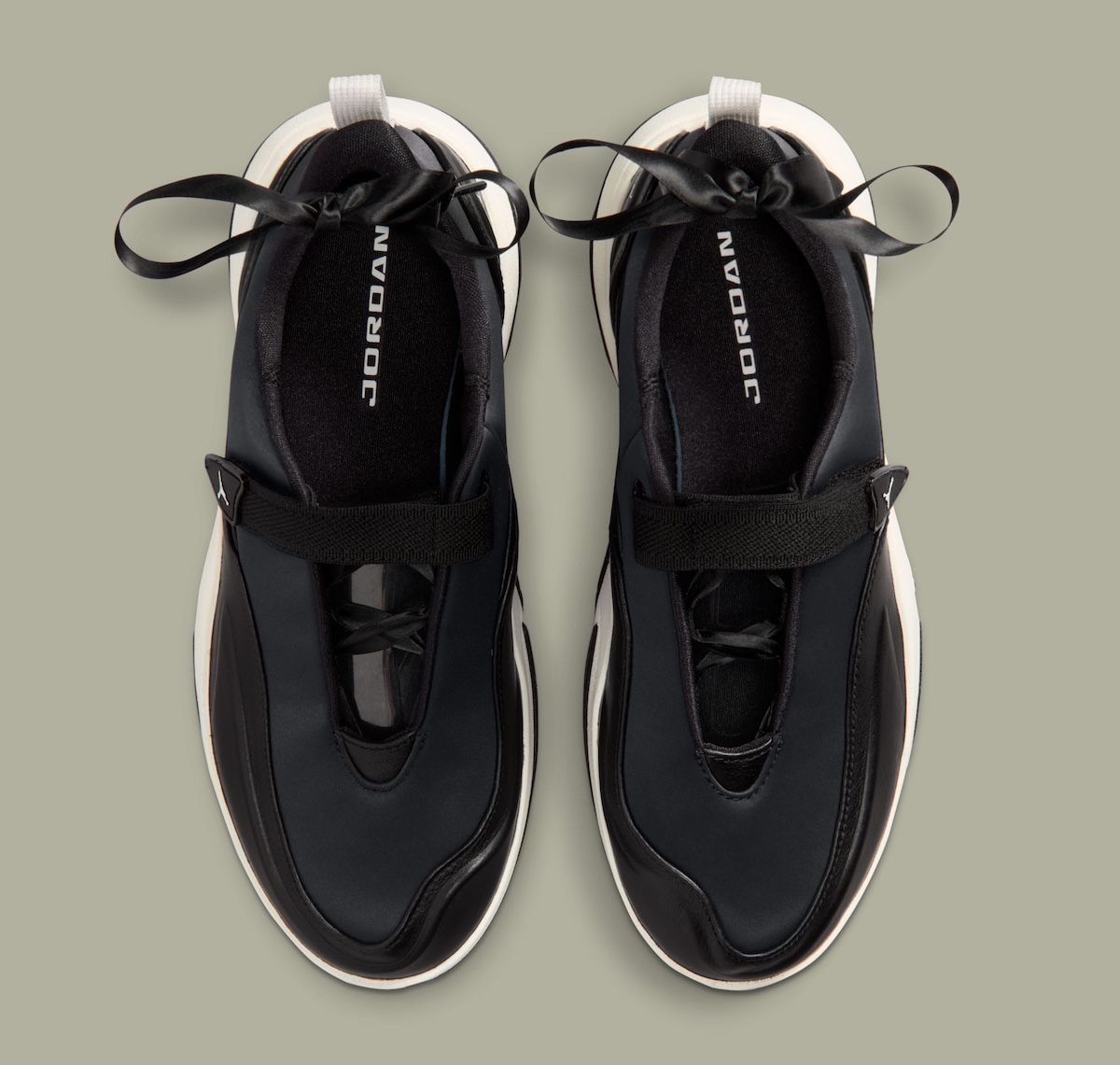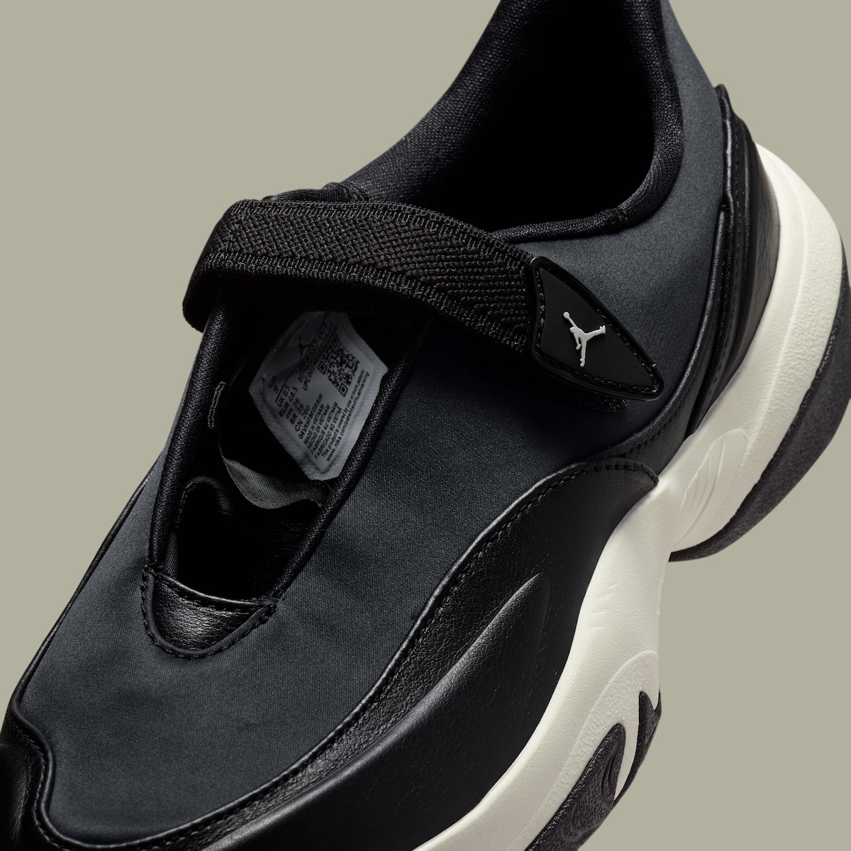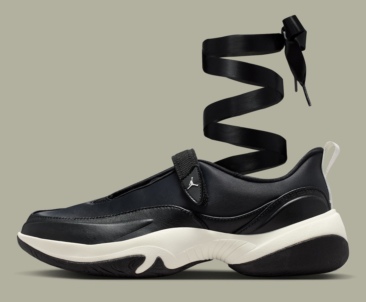 True to form, the silhouette remains relatively minimal. A sleek matte black upper extends clean-cut from toe to heel with only some soft overlays lightly adding structure throughout. Spanning across the midfoot is a wide elastic strap in place of laces that hooks into a triangular Flight badge, allowing branding to remain subtle.