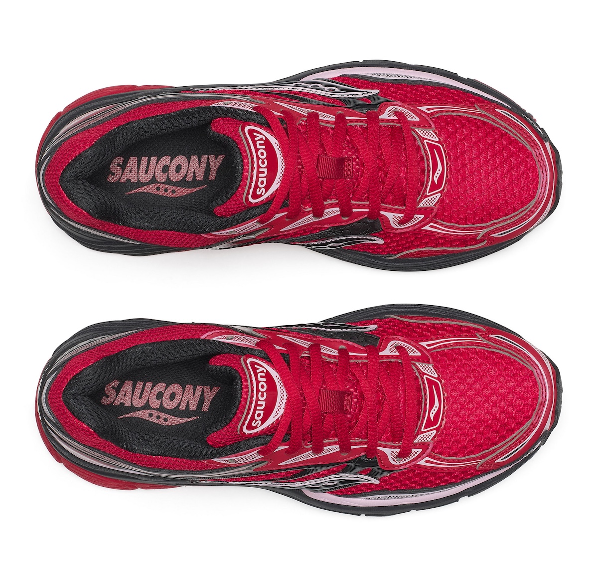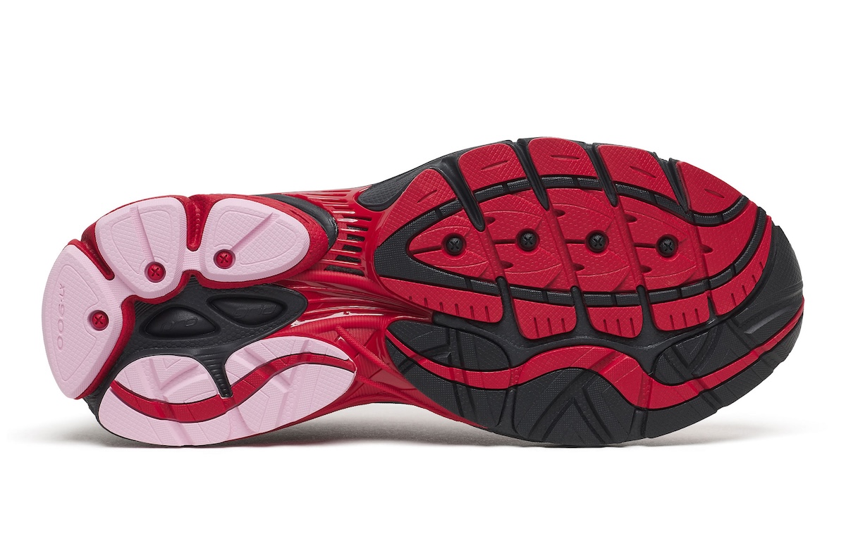 The midsole builds black and red into block shapes that play up the visibility of the ProGrid cushioning. The outsole contrasts dark red tones with lighter pink traction patterns and accentuates screw-studs that reference the sneaker’s performance history. It’s never showy. It comes off as a well thought out seasonal weave.