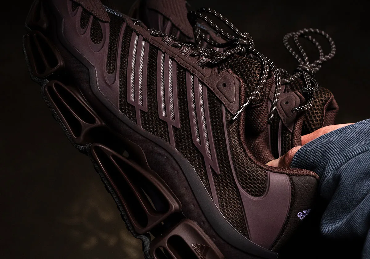 Indeed, the mainline journey is now beginning in a rapid turnaround, as our first look at a somber tonal “Dark Burgundy” comes to light. Again, those who caught our coverage of Chavarria’s coatings will recognize that the hardware top notes remain; molded, ameoba-like Megaride units present a maximalist platform, while the trappings of throwback tech runners pave the way up top. Pinning that against lifestyle-ready monochrome might give an indication of the aesthetics adidas will chase as the kicks become a widely accessible proposition.
