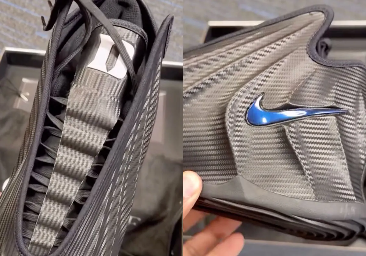 Duke Men’s Basketball Assistant Coach Tyler Thornton revealed a GT Future PE, its typical matte metallic exterior replaced a carbon fiber molding. Immediately, the GT Future achieves that speedy, lightweight aesthetic to match the shoe’s build and performance, while the school’s logo appears at the tongue. The only other reference to the Blue Devils appears via the blue-colored Swoosh on the upper.