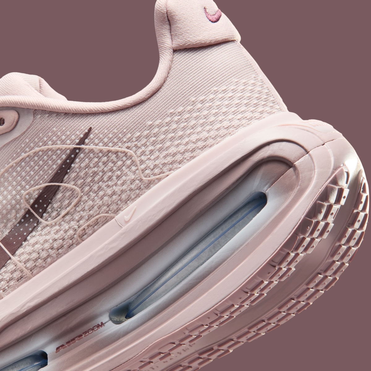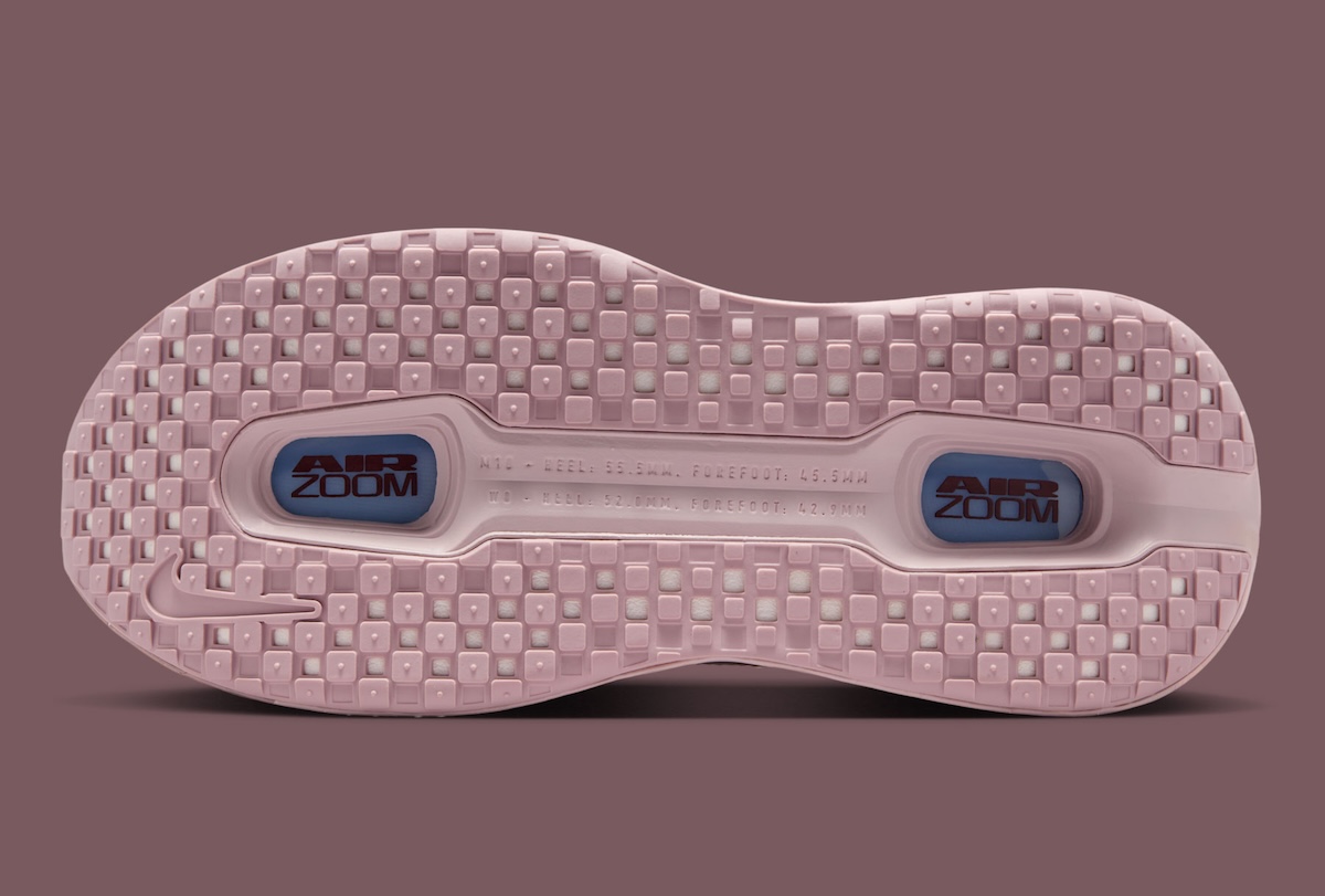 As for the underside, a carved out midsole reveals a full-length Air Zoom unit painted Hydrogen Blue. The cool blue line contrasts gently against the soft pink foam without feeling harsh. A grid-style outsole continues the same pastel theme while delivering reliable traction, with small “AIR ZOOM” markings visible from below.