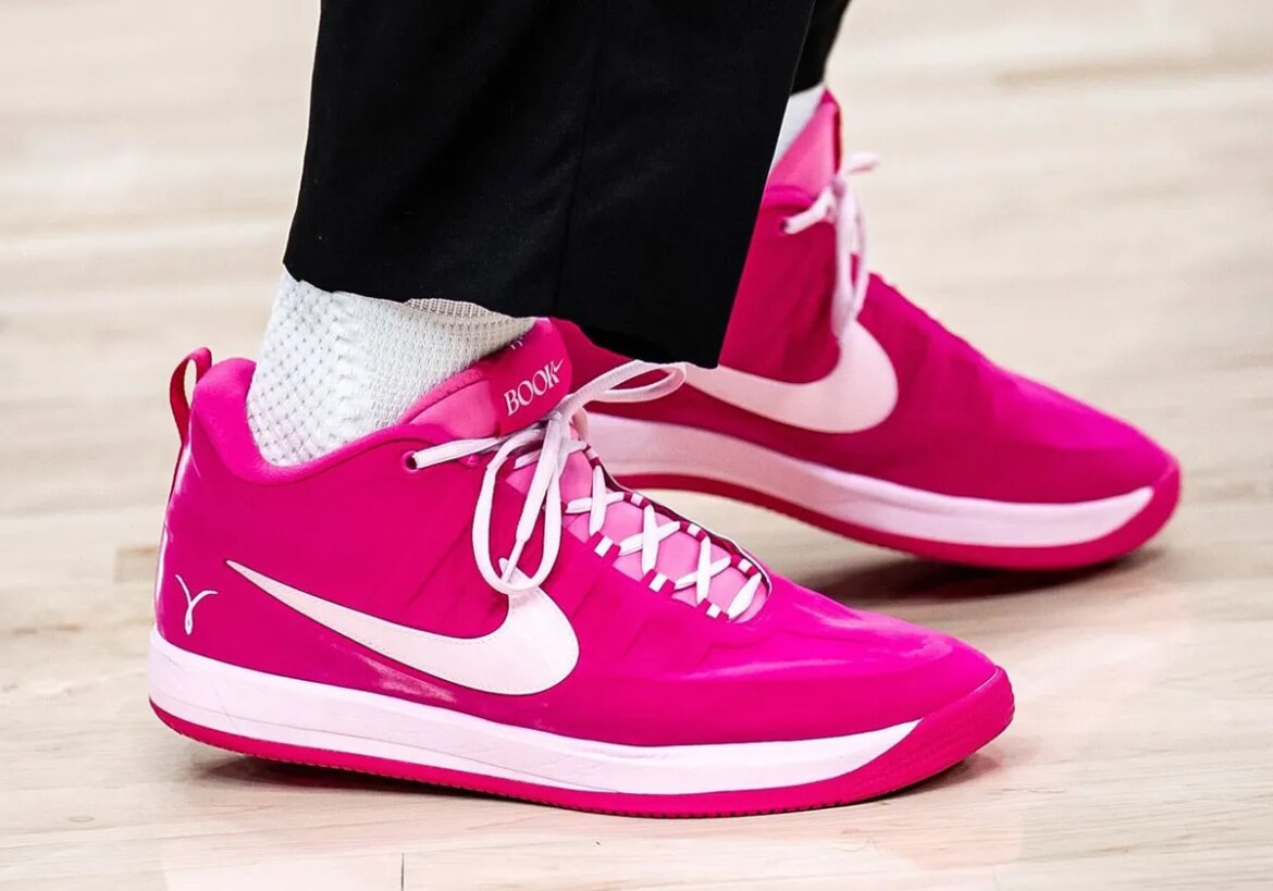 Debuting on the night of February 7th, the Nike Book 2 “Kay Yow” PE was worn by Devin during the pre-game shoot-around session. Opting for a tonal bright pink upper with a matching outsole bottom and white hits on the Swoosh, laces, and midsole, Nike adds the breast cancer awareness ribbon logo at the heel to officially stamp the next chapter of the Kay Yow series. There is no report of these hitting a retail release, so enjoy these photos provided by the Phoenix Suns.