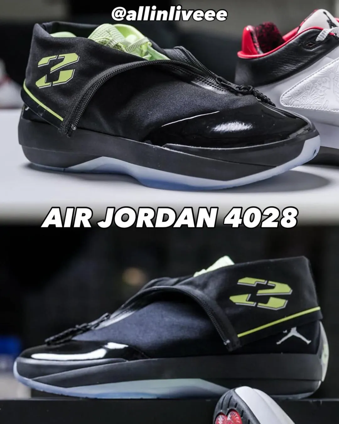A zippered cover wraps the forefoot, concealing bold “2” and “3” graphics that only appear when unsealed. Underneath, a Volt interior directly recalls the Air Jordan XX8s launch palette, while the sculpted midsole and lower collar keep the silhouette aligned with modern performance preferences. Glossy patent panels sit against matte textiles, creating contrast without visual clutter.