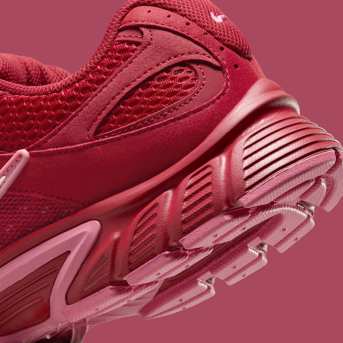 The collar features plush comfort padding to help things feel nice and soft throughout the day. The heelcup shares the same circular mesh cutouts and stiffer overlays as the forefoot. Down below a molded midsole combines deeper scarlet with lighter Peony pigments for a softer contrast of color. Pale-pink hues for the outsole bring it all together with chunky traction segments and defined flex grooves.