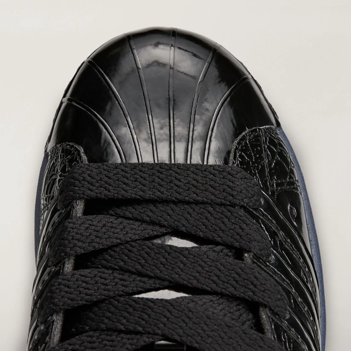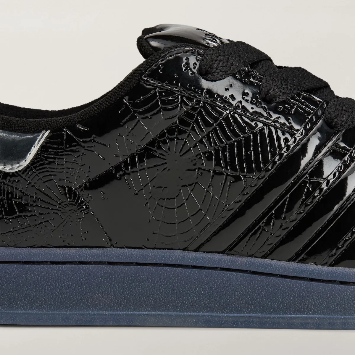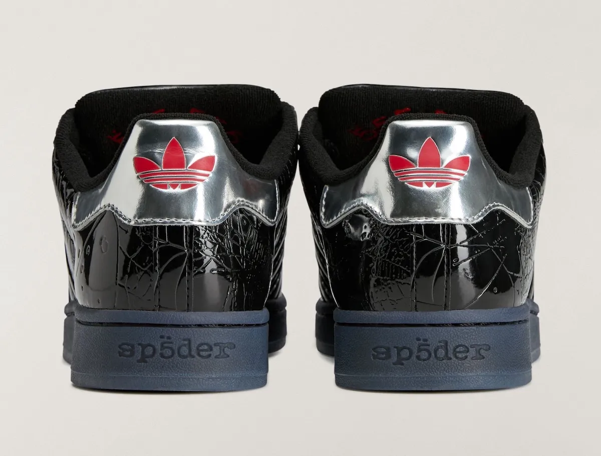 Coated in high-gloss black patent leather, the Sp5der x adidas Superstar follows the same construction as the upcoming “Red/Black” release but leans into a cleaner, more uniform finish. A cracked, web-like embossing still ripples across the upper, bringing texture and depth to the otherwise mirror-like shell toe. The tonal black Three Stripes again sit slightly forward on the side panel, keeping that subtly altered profile while letting this pair read sharper and more streamlined overall.
