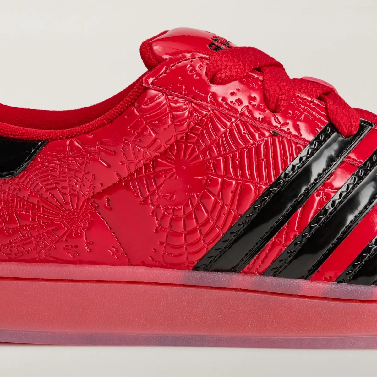 Wrapped in high-gloss red patent leather, the Sp5der x adidas Superstar looks premium at first glance, yet the surface tells a different story. A cracked, spider-web texture stretches across the upper, creating tension between slick polish and raw edge around the shell toe. Meanwhile, the black Three Stripes shift slightly forward on the side panel, subtly altering the silhouette’s profile without drawing attention to the tweak.