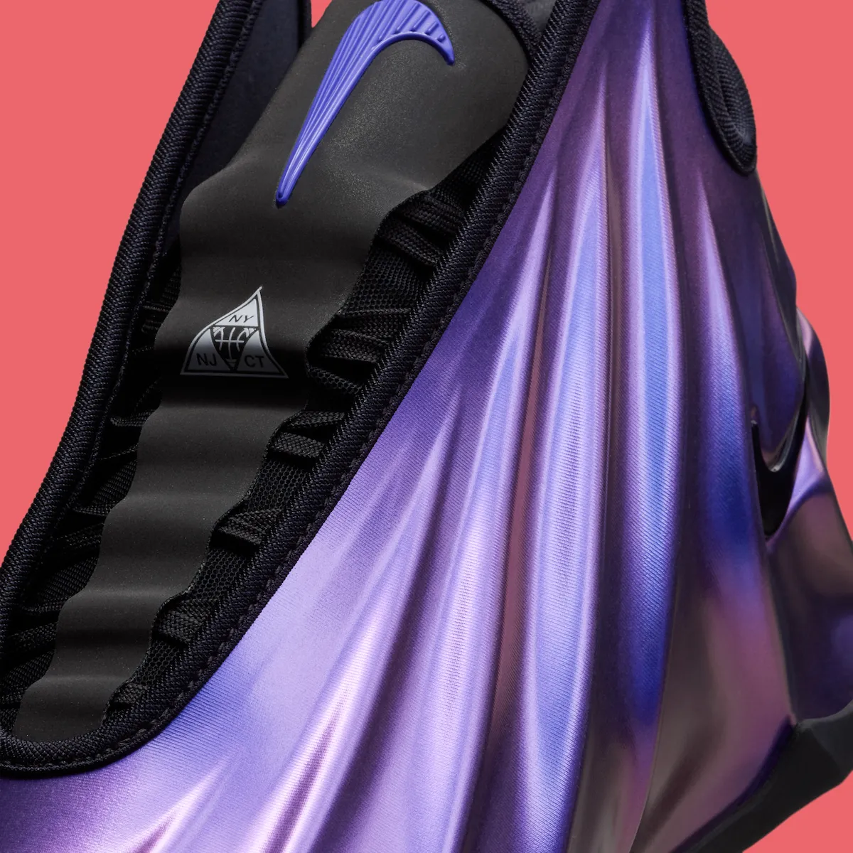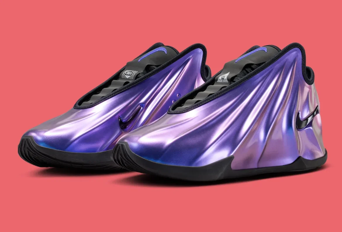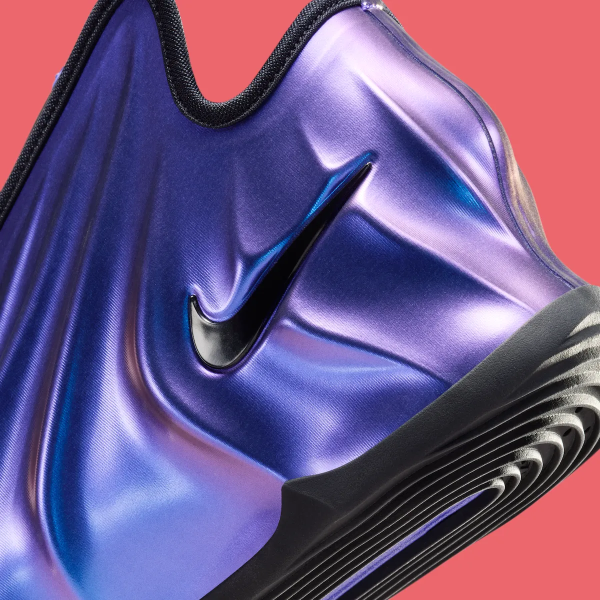 Inevitably, the model continues to draw comparisons to the classic Foamposite lineage. This latest pair won’t quiet those conversations. The molded upper arrives in a glossy “Psychic Purple” finish that instantly calls to mind the iconic “Eggplant” aesthetic. Black accents along the trim and sole unit balance the bold shell, allowing the futuristic build to speak for itself without overcomplication.