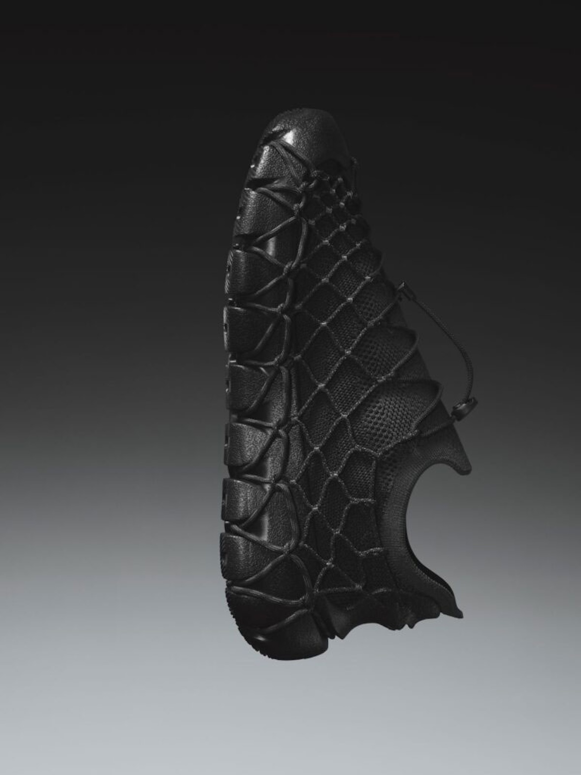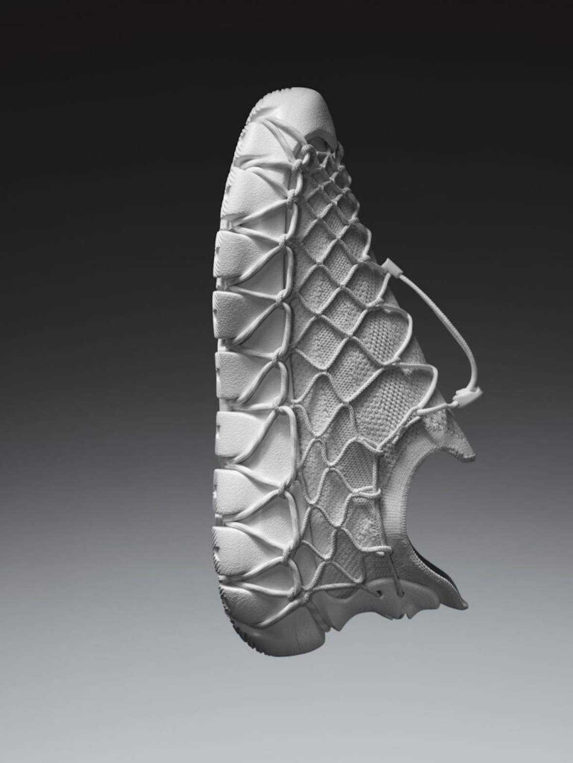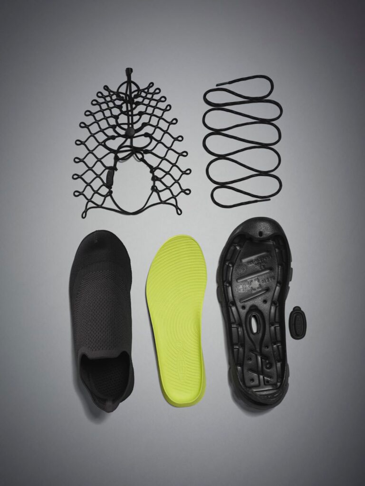 Recycled P.E.T. from plastic bottles shapes both the engineered knit upper and its cord structure. A quick-adjust bungee and toggle system keeps the fit secure, while the modular design maintains the airy identity that defines this open-air sneaker.