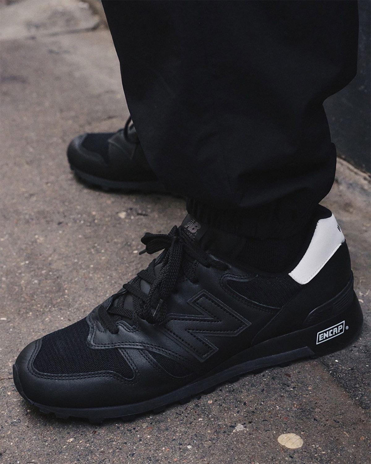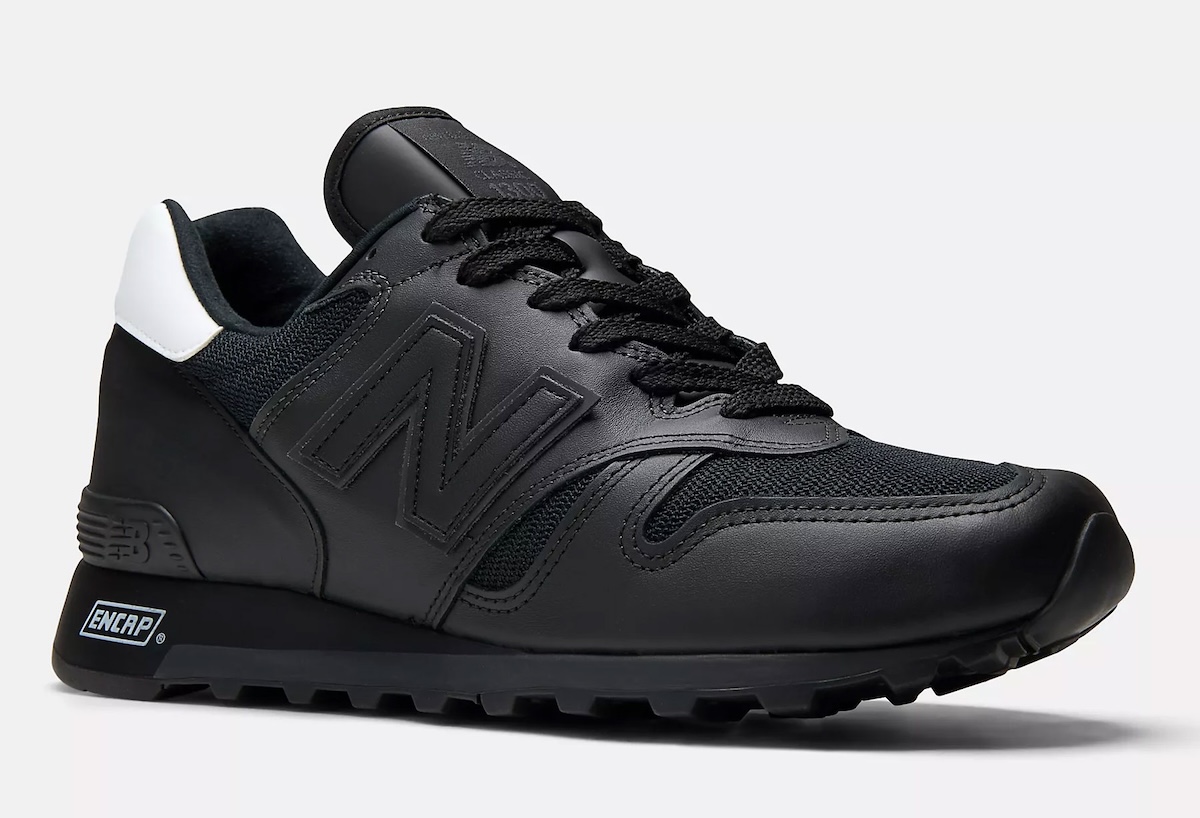 Black leather overlays lead the build, paired with breathable mesh that keeps the structure balanced. Nothing feels overworked. The shape of the silhouette does most of the talking. A tonal “N” logo sits quietly on the side, blending into the upper without pulling attention.