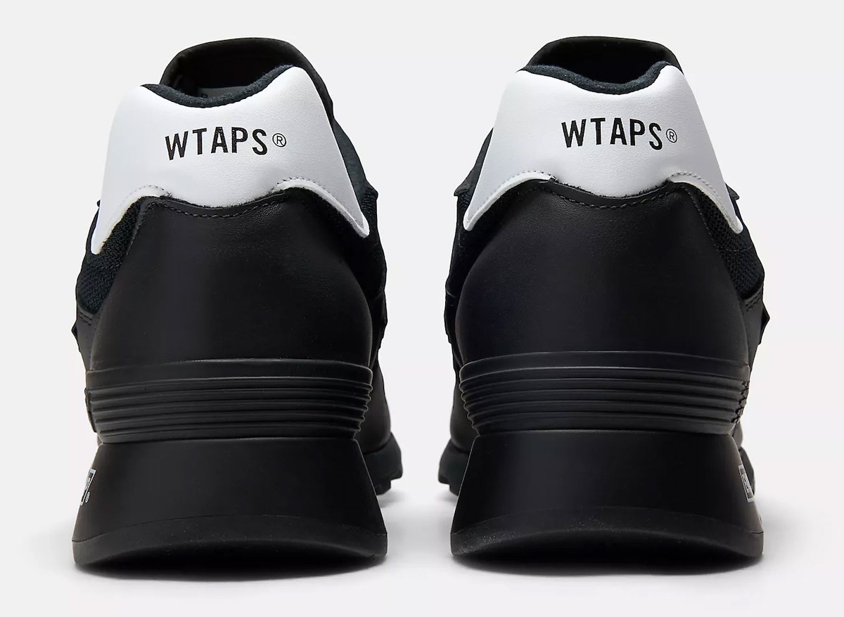 Contrast lands at the heel. A clean white leather tab stamped with WTAPS branding cuts through the blackout finish. It’s a small move, but it changes the entire read. Inside, co-branded insoles add detail without cluttering the exterior.